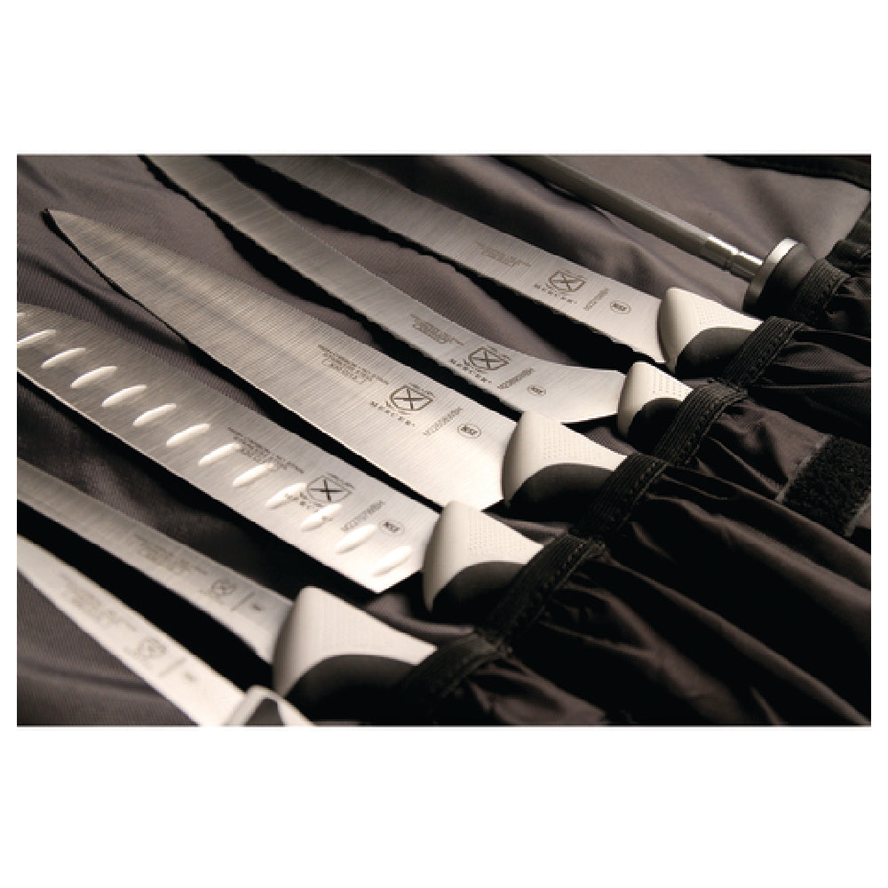 The Mercer Culinary M21821WH Millennia® Knife Roll Set 8 Piece is a comprehensive collection designed for culinary professionals seeking quality and versatility. This set includes a 7-pocket roll with a detachable, adjustable strap, ensuring convenient and secure transport for chefs on the move. The set features a selection of essential knives, each crafted for specific tasks: a 3-1/2" paring knife, a 6" boning knife, an 8" chef's knife, a 9" offset wavy edge bread knife, and a 7" Santoku knife with granton edge, catering to a variety of culinary styles and techniques. Additionally, the set includes a 10" wide wavy edge slicer and a 10" sharpening steel, maintaining the sharpness and precision of your blades. The knives boast white non-slip Santoprene® and polypropylene handles, providing a comfortable and secure grip, reducing the risk of accidents in busy kitchen environments. This knife roll set is NSF certified, affirming its compliance with public health and safety standards, making it a reliable choice for culinary institutions. Ideal for both seasoned chefs and aspiring culinary students, this set embodies a blend of durability, functionality, and ease of use, tailored to meet the rigorous demands of the food service industry.