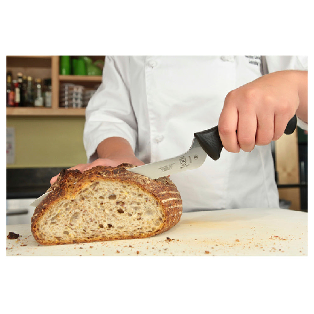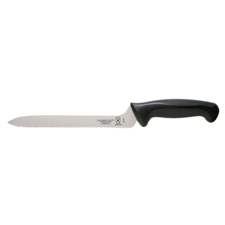 The Mercer Culinary M22408 Millennia® Knife 8" Offset is a meticulously engineered culinary tool, distinguished by its precision-stamped construction from high carbon Japanese steel. This knife is designed with a uniquely wavy edge that enhances its slicing capabilities, making it an essential asset for professional chefs and home cooking enthusiasts alike. The offset design ensures that your hands remain clear of the cutting surface, providing added safety and comfort during use. The handle, crafted from a blend of black non-slip Santoprene® and polypropylene, features textured finger points and a protective finger guard, promoting a secure grip even in the busiest kitchen environments. With its NSF certification, this knife meets rigorous public health standards, assuring users of its safety and quality. Ideal for various market segments, from commercial kitchens to culinary students, the Mercer Culinary M22408 Millennia® Knife 8" Offset delivers exceptional performance with its advanced material composition and ergonomic design, making it a versatile choice for a wide range of cutting tasks. Its high-quality construction ensures durability and reliability, offering unparalleled value to those looking for a dependable and efficient knife.