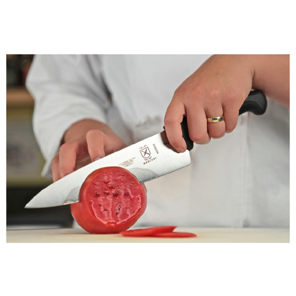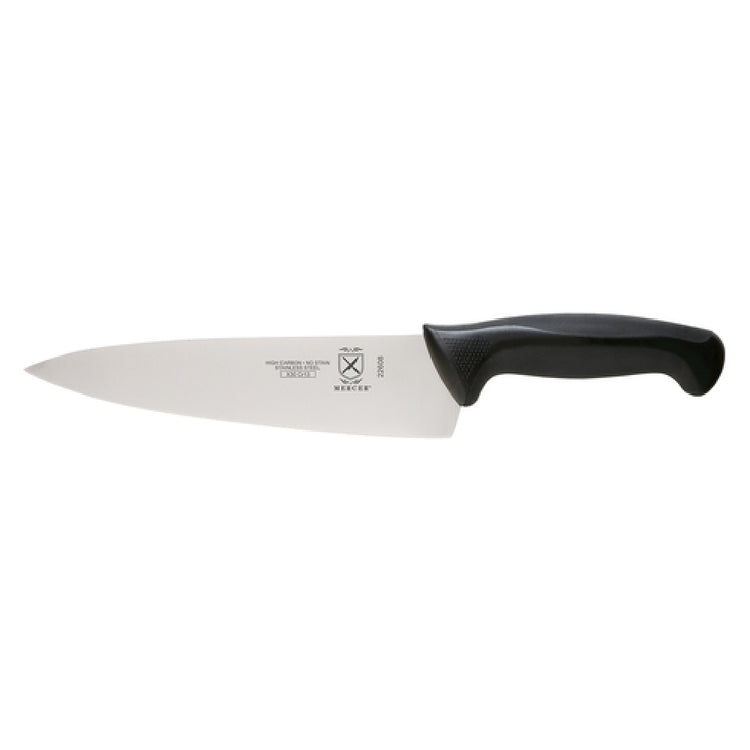 The Mercer Culinary M22608 Millennia® Chef's Knife 8" Stamped is a culinary tool engineered for precision and reliability, tailored to meet the diverse demands of both professional chefs and culinary enthusiasts. Crafted from high carbon Japanese steel, this knife offers exceptional sharpness and edge retention, making it a dependable choice for a variety of cutting tasks. The blade is stamped, providing a lighter weight for enhanced maneuverability and control. This knife features a black non-slip Santoprene® and polypropylene handle, ensuring a comfortable and secure grip, even in wet conditions. Textured finger points and a protective finger guard enhance safety and stability during use, reducing the risk of accidents. Endorsed by the NSF, this knife meets rigorous public health and safety standards, making it a trustworthy addition to any kitchen. The Mercer Culinary M22608 Millennia® Chef's Knife is designed to cater to the intricate needs of the culinary industry, offering a blend of innovative design, superior material quality, and user-focused features, ideal for precision culinary work and efficient kitchen operations.