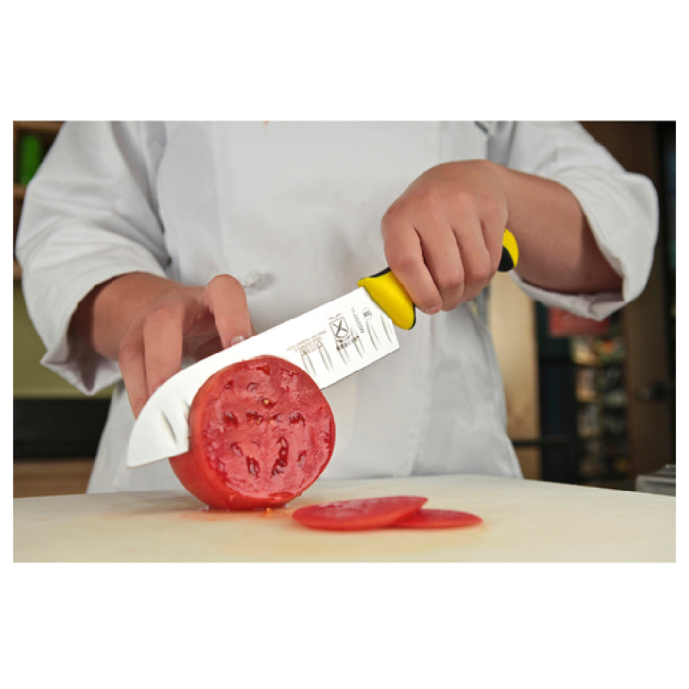 The Mercer Culinary M22707YL Millennia Colors® Santoku Knife 7" Granton Edge is a masterfully engineered kitchen tool, ideal for culinary professionals and cooking enthusiasts alike. Featuring a 7-inch blade crafted from high-carbon Japanese steel, this knife ensures exceptional sharpness and durability, maintaining its edge for precision cutting tasks. The blade's Granton edge is designed to create air pockets, reducing drag and preventing food from sticking, which enhances the efficiency of slicing. The knife is stamped rather than forged, offering a lighter feel and increased maneuverability. The handle is a combination of yellow non-slip Santoprene® and polypropylene, ensuring a comfortable and secure grip, even in wet conditions, thanks to its textured finger points. An integral protective finger guard adds an element of safety, making it suitable for fast-paced kitchen environments. This knife is NSF certified, affirming its adherence to rigorous public health standards. The Mercer Culinary M22707YL Santoku Knife is not only a testament to superior craftsmanship but also a versatile addition to any kitchen, accommodating a wide range of cutting tasks with ease and precision.