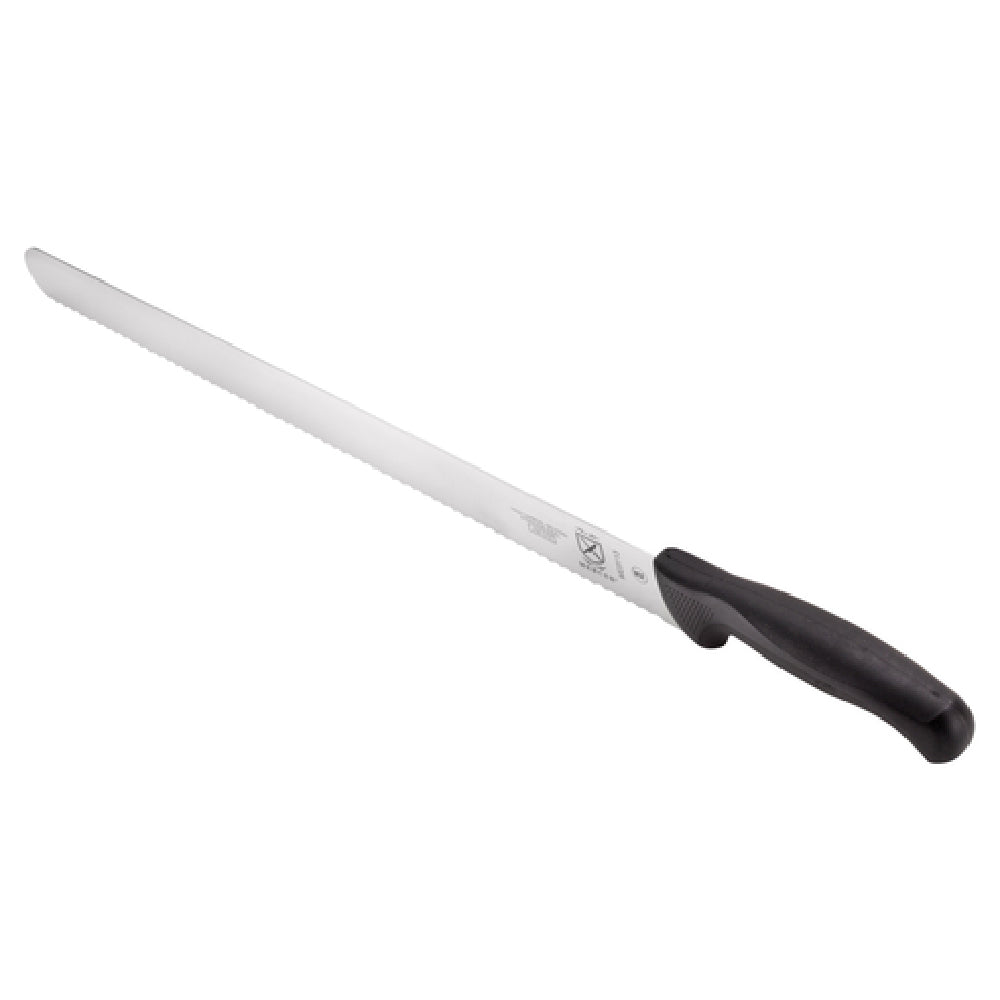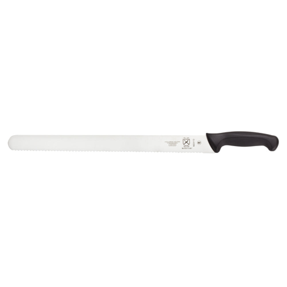 The Mercer Culinary M23113 Millennia® Cake Slicer Knife 16" Wavy Edge exemplifies precision and performance through its expertly crafted design. This slicer knife features a 16-inch blade constructed from high carbon, Japanese steel, ensuring a durable and sharp edge that excels in slicing through various cake textures with ease. The wavy edge design is particularly advantageous for clean cuts, reducing the potential for cake crumbling or tearing. Accompanied by a stamped construction, the knife balances strength and flexibility, optimizing it for professional kitchen use. For user safety and comfort, the knife is equipped with a black non-slip handle combining Santoprene® and polypropylene materials, known for their resilience and tactile grip. Textured finger points and a protective finger guard further enhance handling safety, making it an ideal tool for culinary professionals who prioritize precision and safety. This knife is NSF certified, verifying its adherence to high safety and quality standards, and making it suitable for use in commercial kitchens where hygiene and reliability are paramount. The Mercer Culinary M23113 Millennia® Cake Slicer Knife is a valuable tool for pastry chefs, bakers, and caterers seeking a high-performance slicing solution tailored to meet the rigorous demands of the food service industry.