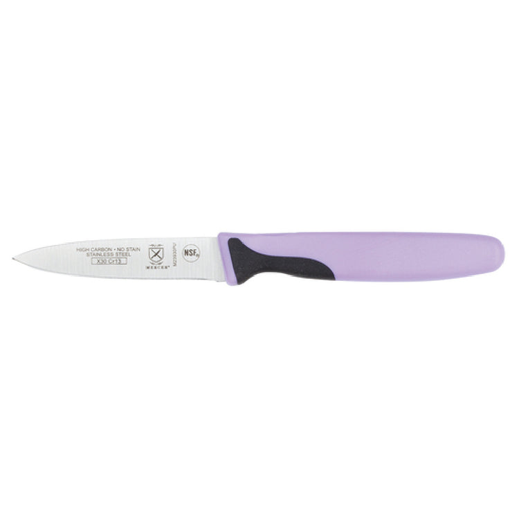 The Mercer Culinary M23930PUB Millennia® Color Paring Knife Refill Pack is a precision tool designed for countertop paring knife displays, making it a strategic choice for culinary operations requiring efficient and organized knife management. This refill pack includes 3-inch stamped paring knives crafted from high carbon Japanese steel, renowned for its sharpness and durability. The unique purple coloration of the knives serves a dual purpose: it can be used for allergen segregation, integrated into HACCP systems, or designated for specific culinary tasks, thereby enhancing kitchen safety and efficiency. Each knife features a handle combining Santoprene® and polypropylene, offering ergonomic comfort and a secure grip due to its textured finger points. The knives are NSF certified, ensuring they meet rigorous health and safety standards crucial for professional kitchens. Sold in full box lots, each box contains 12 knives, providing ample supply for high-volume use in diverse food service environments. The Mercer Culinary M23930PUB is an ideal solution for establishments looking to maintain a high standard of hygiene and safety with reliable, easy-to-manage tools, tailored for various culinary applications.