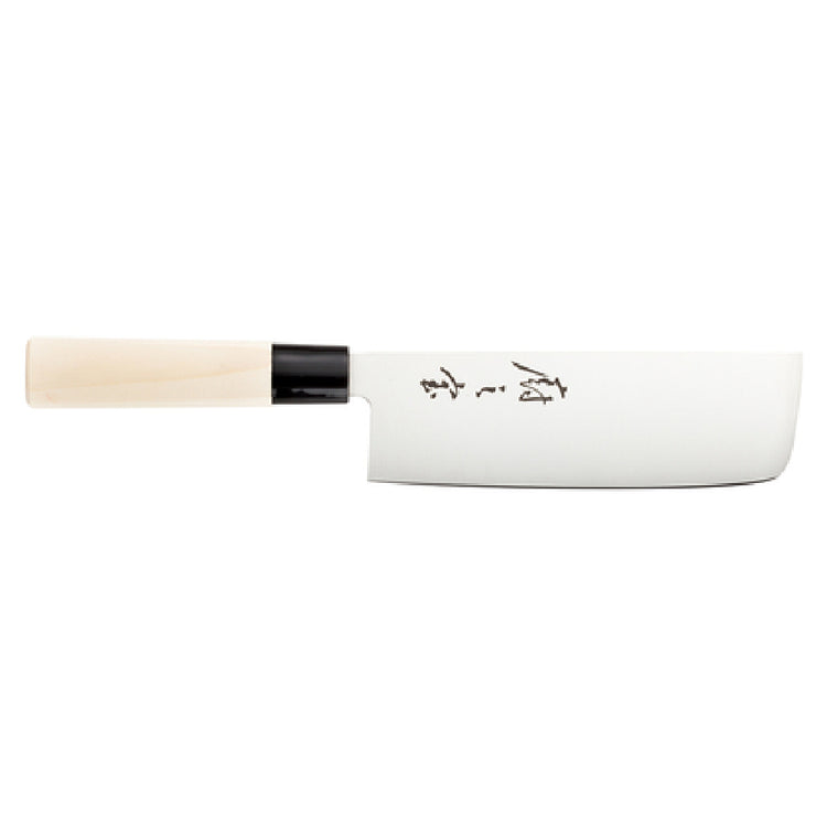 The Mercer Culinary M24307 Asian Collection Nakiri Vegetable Knife 7" Stamped is a precision tool designed for culinary professionals and enthusiasts who value quality and performance in their kitchen tools. This Nakiri knife, measuring 7 inches, features a blade that is meticulously crafted from high carbon German steel, known for its durability and resistance to corrosion. The blade is stamped, contributing to its lightweight nature, which enhances maneuverability and ease of use. With a double-edge blade angle of 15° on both sides, this knife ensures exceptional sharpness and precision, making it ideal for tasks that require fine and consistent vegetable cuts. The wooden handle complements its functionality with an ergonomic design, providing a comfortable grip that allows for prolonged use without discomfort. The combination of these high-quality materials and thoughtful design makes the Mercer Culinary M24307 a valuable tool for both professional kitchens and home cooks seeking to elevate their culinary skills. Whether used in high-volume restaurant settings or for home meal prep, this Nakiri knife is tailored to meet the diverse needs of different market segments within the culinary industry, emphasizing reliability and precision in vegetable preparation.