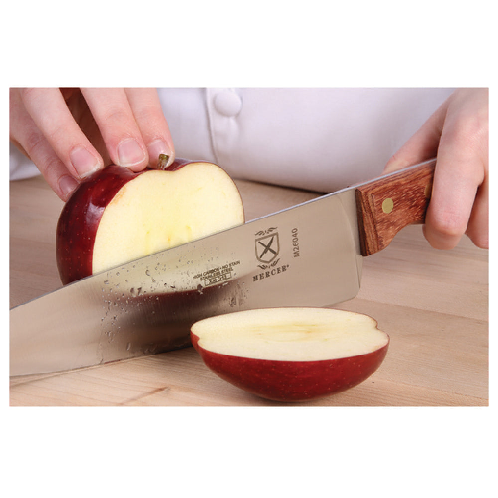 The Mercer Culinary M26040 Praxis® Chef Knife 8" Stamped is a meticulously crafted culinary tool, designed with precision and versatility in mind for both professional chefs and home cooking enthusiasts. This knife features a one-piece construction, ensuring durability and a seamless cutting experience. It is made from high-carbon Japanese stainless steel, known for its exceptional sharpness and corrosion resistance, making it a reliable choice for various kitchen tasks. The blade is stamped, allowing for a lighter weight and ease of handling, which is beneficial for extended use in busy kitchen environments. The knife's rosewood handle is elegantly designed, providing a comfortable grip and aesthetic appeal, enhanced by three compression brass rivets that add both strength and a classic touch. This blend of high-quality materials and thoughtful design elements makes the Mercer Culinary M26040 Praxis® Chef Knife a valuable asset in the culinary industry, catering to diverse market segments that prioritize precision, durability, and style in their kitchen tools.
