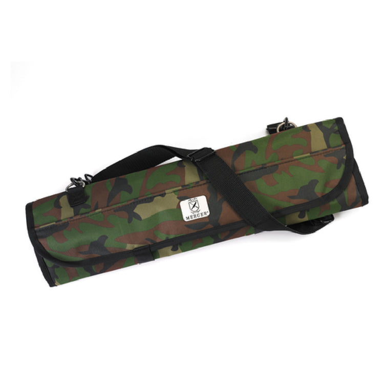 The Mercer Culinary M30007CM Mercer Cutlery Knife Roll is an expertly crafted solution for culinary professionals requiring efficient and secure transportation of their valuable knives. Measuring 21 inches by 8 inches by 1 inch when rolled, this knife roll is designed for compact and convenient portability. It features seven elastic pockets that securely hold a variety of knives and culinary tools, ensuring that each piece is easily accessible and well-protected. The heavy-duty construction of this knife roll ensures durability and longevity, making it a reliable companion for chefs on the move. A hook-and-loop closure provides a secure seal, preventing any accidental openings during transport. For added convenience, the knife roll includes a shoulder strap, allowing for easy carrying. The camouflage design adds a unique aesthetic touch, catering to chefs looking for style alongside functionality. It is important to note that cutlery is not included with the knife roll. This versatile product is ideal for culinary students, professional chefs, and caterers who prioritize both practicality and protection for their essential tools.