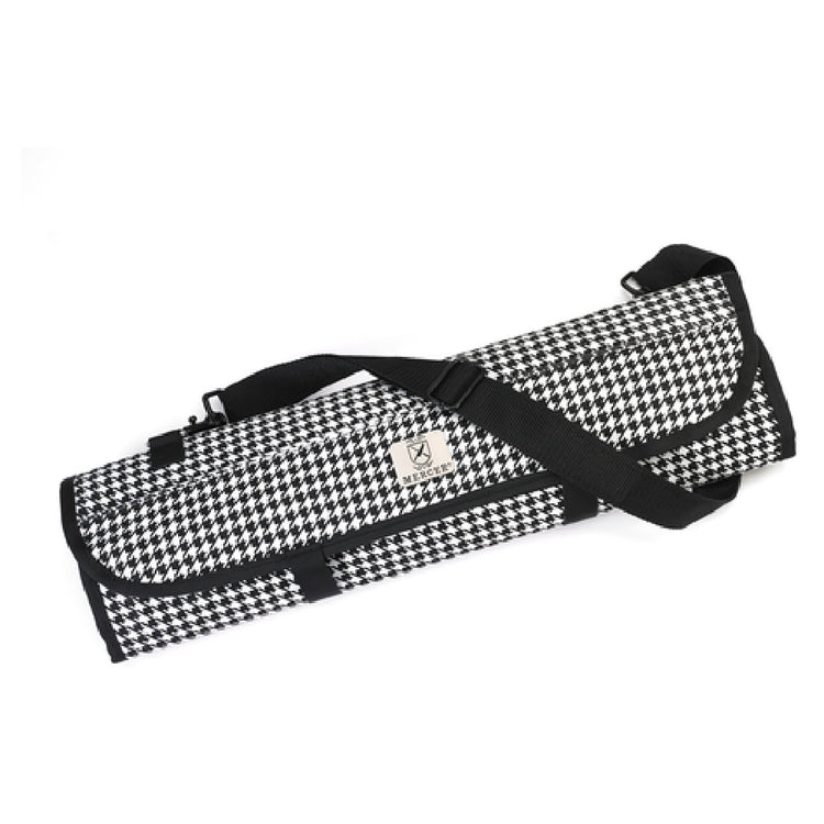 The Mercer Culinary M30007HT Mercer Cutlery Knife Roll is a meticulously designed storage solution measuring 21" x 8" x 1" when rolled, making it a compact yet highly efficient accessory for culinary professionals. It features seven elastic pockets, providing ample space for securely holding a variety of knives, ensuring that culinary tools are organized and protected. Constructed with heavy-duty materials, this knife roll is built to withstand the rigorous demands of professional kitchens. The inclusion of a hook-and-loop closure system ensures the roll remains tightly secured during transport. Additionally, it is equipped with a convenient shoulder strap, offering ease of mobility for chefs on the go. The hounds tooth pattern adds a touch of classic style to its functional design. Notably, the knife roll is designed without cutlery, providing a customizable storage option for chefs who prefer to select their own set of knives. This product is particularly beneficial for culinary students, traveling chefs, and catering professionals, who require a reliable and durable method to transport their essential cutlery. The Mercer Culinary M30007HT is a versatile and valuable tool for anyone in the culinary industry seeking organized and secure knife storage.