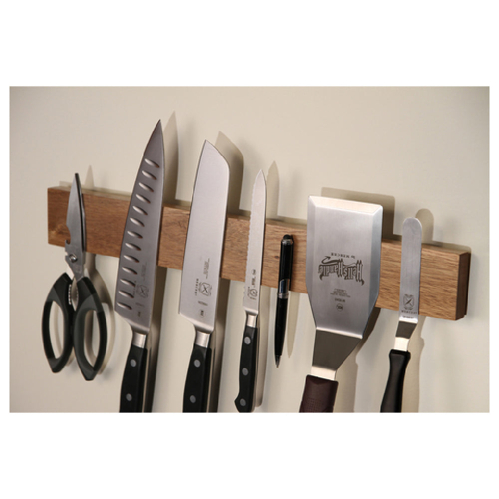 The Mercer Culinary M30731AC Magnetic Bar 18" is a versatile and essential tool for any professional kitchen, offering both organization and convenience. This magnetic bar measures 18 inches in width, 2-3/8 inches in depth, and 3/4 inches in height, making it a compact yet effective solution for safely storing knives and other metal kitchen utensils. The bar is constructed with recessed magnets, ensuring that your tools are held securely in place without the risk of slipping. This design feature is particularly beneficial for busy culinary environments where safety and efficiency are paramount. The rear keyhole mounting slots allow for easy and versatile installation, accommodating various kitchen layouts and preferences. Crafted from durable acacia wood, the Mercer Culinary M30731AC not only provides functionality but also adds a touch of elegance to your kitchen space. Its natural wood finish complements a wide range of kitchen styles, making it suitable for both modern and traditional decors. This magnetic bar is an ideal choice for chefs, culinary students, and home cooking enthusiasts who seek an efficient and stylish way to organize their kitchen tools, ensuring quick access while maintaining a tidy and professional workspace.