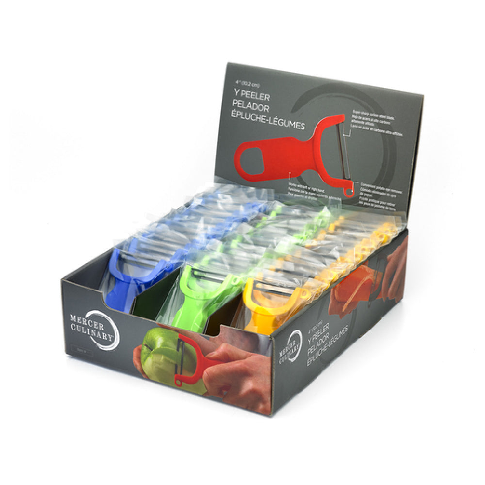 The Mercer Culinary M33074 Y-Peeler is a versatile kitchen tool measuring 4 inches in overall length, designed to meet the diverse needs of culinary professionals and home cooks alike. Its ergonomic textured polypropylene handle ensures a comfortable and secure grip, reducing hand fatigue during prolonged use. The high-carbon steel blade provides exceptional sharpness and durability, making it ideal for peeling a wide variety of fruits and vegetables with precision. Additionally, the peeler features an integral potato eye remover, enhancing its functionality and convenience in food preparation tasks. A hanging hole adds practicality, allowing for easy storage and organization in busy kitchen environments. The peeler is available in an assortment of colors - blue, green, and yellow - which not only adds a vibrant touch to the kitchen but also aids in quick identification and organization. Each pack contains 36 peelers, with an assortment of 12 peelers in each color, making it a suitable option for retail counter displays. The Mercer Culinary M33074 Y-Peeler is a practical and reliable choice for culinary experts in professional kitchens, catering services, and enthusiastic home chefs, offering a combination of durability, functionality, and aesthetic appeal.
