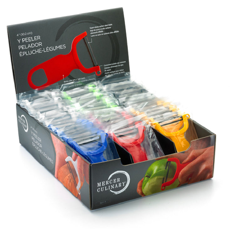 The Mercer Culinary M33075 Y-Peeler is a versatile kitchen tool designed with precision and functionality in mind. With an overall length of 4 inches, this peeler features an ergonomic textured polypropylene handle, ensuring a comfortable and secure grip during use. Its high-carbon steel blade delivers exceptional sharpness and durability, making it ideal for efficiently peeling a variety of fruits and vegetables. An integral potato eye remover adds to its functionality, allowing users to easily remove blemishes from produce. The Y-peeler comes equipped with a convenient hanging hole for easy storage, enhancing its practicality in any kitchen setting. Available in an assortment of vibrant colors including black, blue, green, red, white, and yellow, it not only adds a pop of color to your culinary tools but also facilitates quick identification and organization. Designed for retail counter display, each pack contains 36 peelers, with 6 of each color. This peeler is suitable for both professional chefs and home cooks who value quality and efficiency in their kitchen utensils, making it an essential tool for a wide range of culinary tasks. Its blend of ergonomic design and high-quality materials ensures it meets the diverse needs of the food service industry.