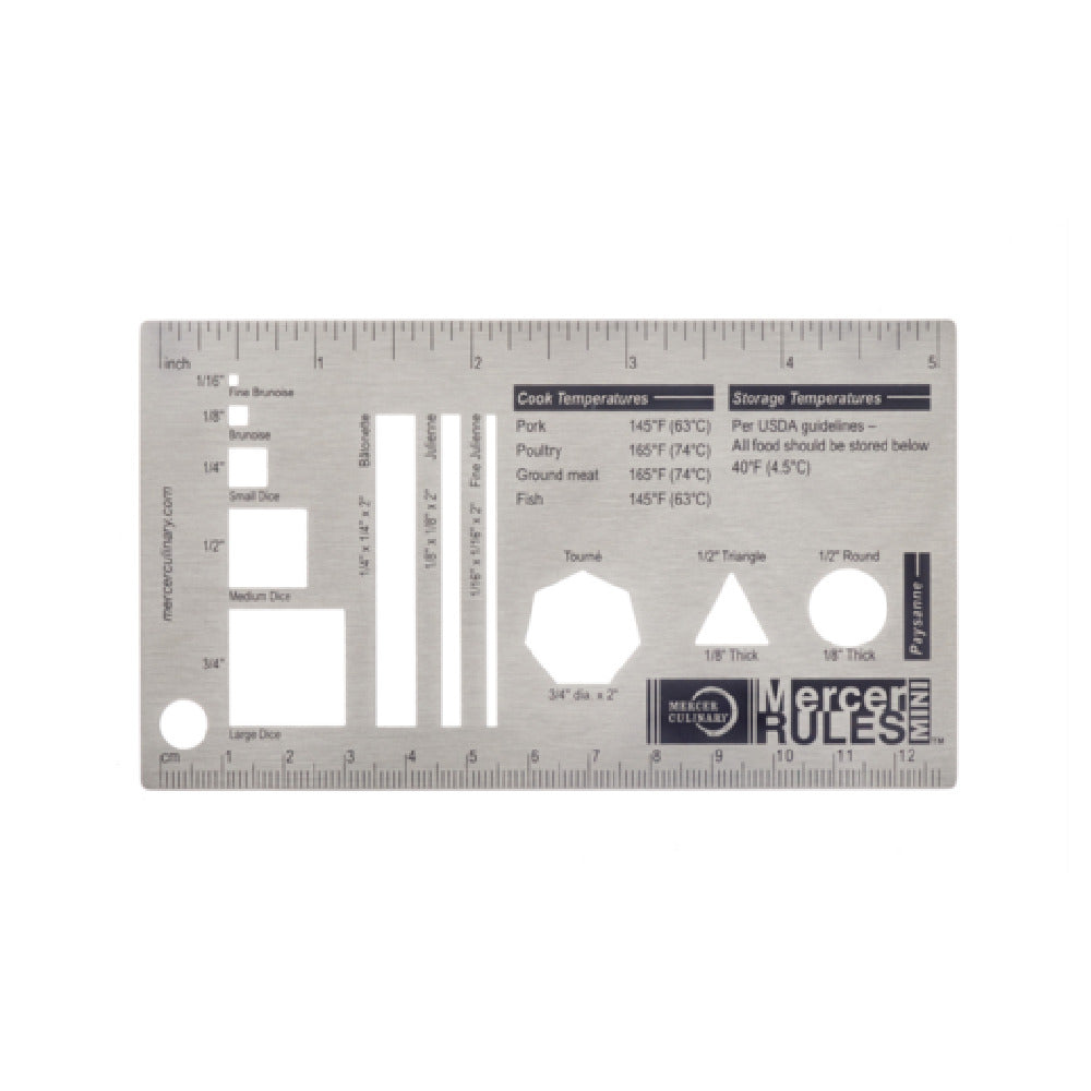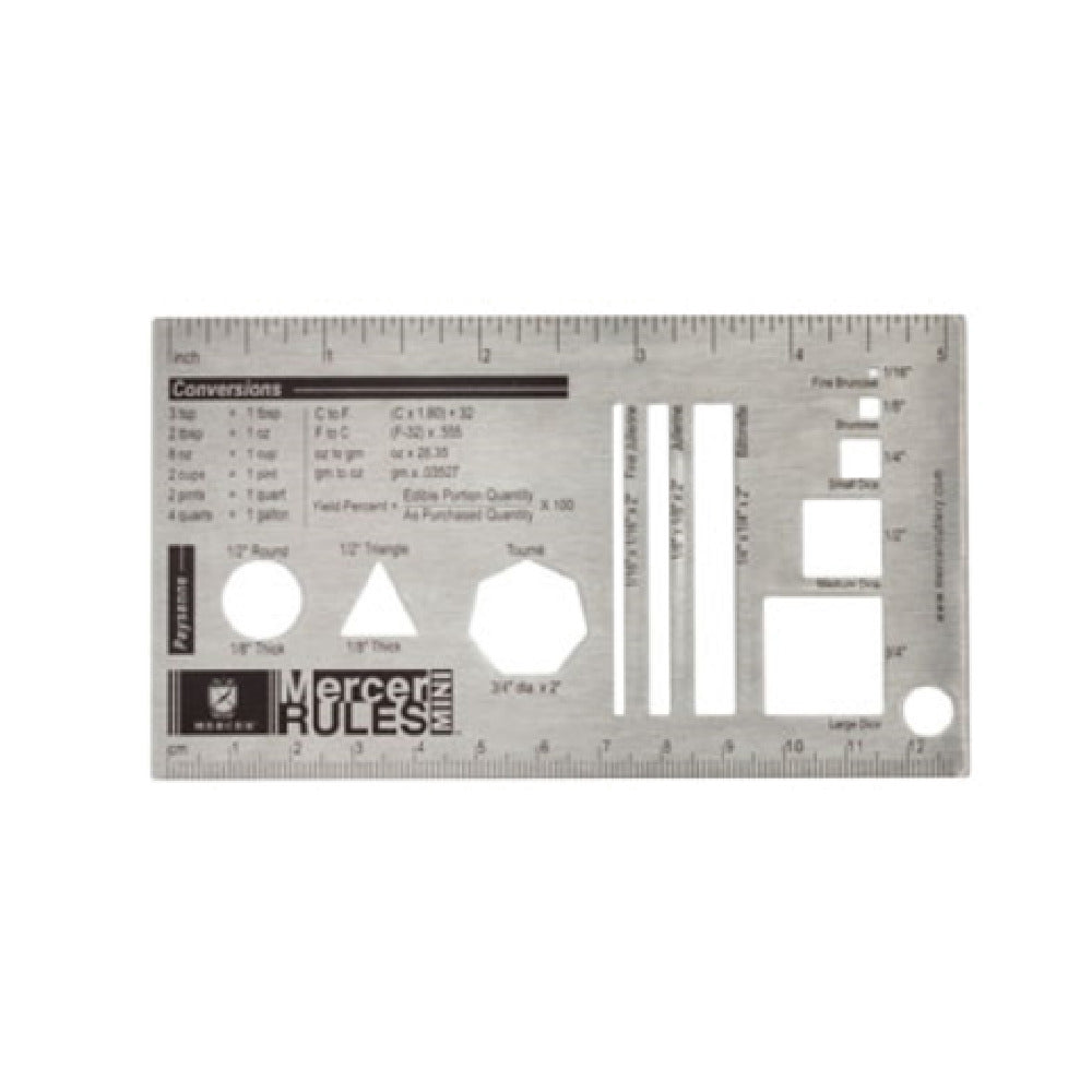 The Mercer Culinary M33243 Mercer Rules Mini™ is a compact and versatile tool designed for culinary professionals and enthusiasts alike, measuring at 5-1/4" x 3". Its size is crafted to conveniently fit into a shirt or chef coat pocket, allowing for easy accessibility and portability in fast-paced kitchen environments. This innovative product is constructed from durable stainless steel, ensuring longevity and resilience in demanding conditions. The Mercer Rules Mini™ features both US and metric measurements, making it an ideal tool for chefs and cooks working in diverse kitchens that require precise ingredient calculations. Additionally, it includes ingredient ratios and cut shapes, providing invaluable assistance to culinary experts in achieving consistency and precision in their food preparation. This tool is perfectly suited for chefs, culinary students, and food enthusiasts who value accuracy and efficiency in their craft. The Mercer Culinary M33243 Mercer Rules Mini™ stands out as an essential instrument in any kitchen, combining practicality with professional-grade functionality for a wide range of culinary applications.
