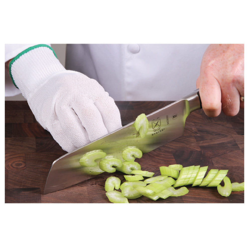 The Mercer Culinary M33411M MercerGuard™ Cut Glove Size M 13 Gauge is a versatile tool designed for safety and durability in various industrial, culinary, and food service environments. This glove boasts an ultra-high molecular weight polyethylene reinforced knit construction, providing robust protection. It is engineered with ANSI level A4 cut protection, making it a reliable choice for tasks that involve sharp tools. The glove fits both the left and right hand, ensuring flexibility and convenience for the user. Its permanent antimicrobial protection helps maintain hygiene standards, crucial in food preparation and handling. Additionally, this cut glove is washable and bleach safe, promoting easy maintenance and longevity. Made from FDA-approved materials, it meets stringent safety and quality standards. The glove features a color-coded cuff, with a green cuff indicating its medium size, aiding quick identification in busy work settings. Proudly made in the USA, the white glove with a green cuff is a testament to quality craftsmanship and attention to detail. This product is ideal for professionals across different segment markets who prioritize safety, hygiene, and durability in their daily operations.