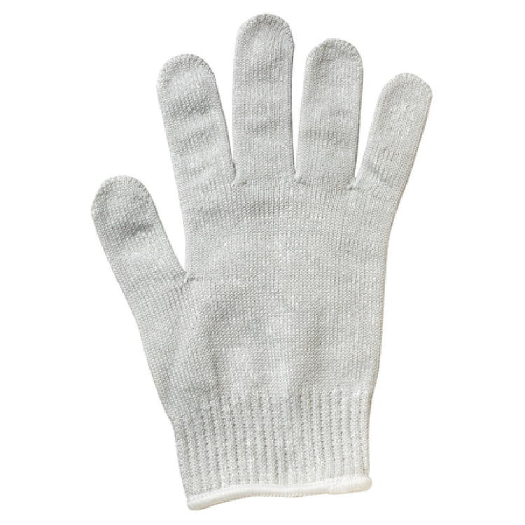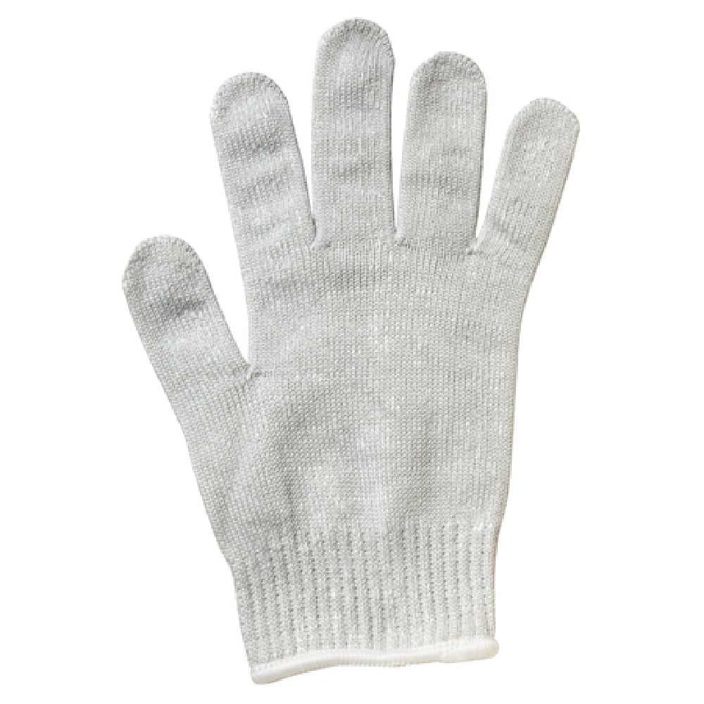 The Mercer Culinary M33413L Millennia® Cut Glove Size L 10 Gauge is a highly durable and versatile protective glove designed for both left and right-hand use. This glove is constructed with stainless steel reinforcement, providing ANSI level A5 cut protection, which is one of the highest safety ratings for cut resistance. Its 10-gauge design ensures a comfortable fit for large-sized hands, while the color-coded cuff allows for easy size identification, specifically white with a matching white cuff. Notably, the Mercer Culinary M33413L is both washable and bleach safe, ensuring longevity and hygiene in demanding culinary environments. Approved by the FDA for its materials, this glove is suited for professional kitchens where safety and compliance are paramount. It's an ideal choice for chefs, butchers, and food service professionals who require reliable hand protection without compromising on flexibility or comfort, making it a valuable asset in any culinary setting. The product's unique blend of safety, durability, and ease of maintenance sets it apart in the industry, serving the needs of diverse market segments where protective handwear is essential.
