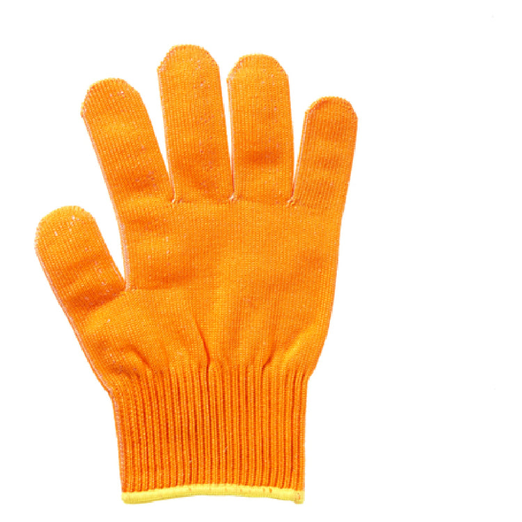 The Mercer Culinary M33415ORXS Millennia Colors® Cut Glove Size XS 13 Gauge stands out as a essential piece in personal safety equipment, particularly in culinary environments. With its ANSI Level A4 cut protection, this glove is engineered for high-risk tasks, offering superior defense against cuts and lacerations. Crafted from ultra high molecular polyethylene, it provides exceptional durability and strength while maintaining flexibility and comfort for the wearer. The glove's vibrant orange color with a gold cuff not only enhances visibility but also adds a touch of style to kitchen safety gear. Designed to fit both left and right hands, it ensures versatility and convenience in any fast-paced kitchen setting. This glove is washable and bleach safe, supporting rigorous hygiene standards while ensuring longevity and repeated usability. Made from FDA approved materials, it emphasizes safety and compliance within food handling environments. The 13-gauge construction balances protection with dexterity, allowing users to handle tasks with precision. Available in size XS, it caters to a wide range of users, ensuring a snug fit for smaller hands. The Mercer Culinary M33415ORXS is an optimal choice for chefs and kitchen staff seeking reliable hand protection in dynamic culinary operations.
