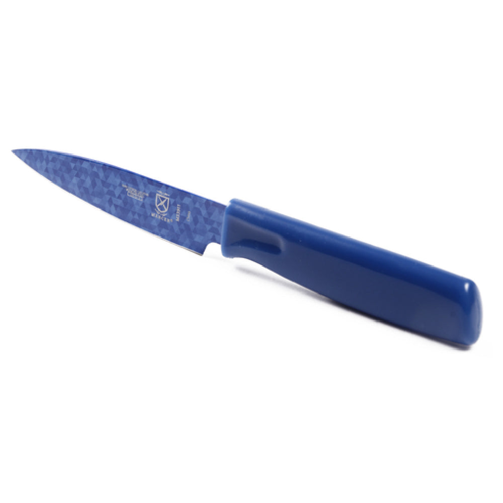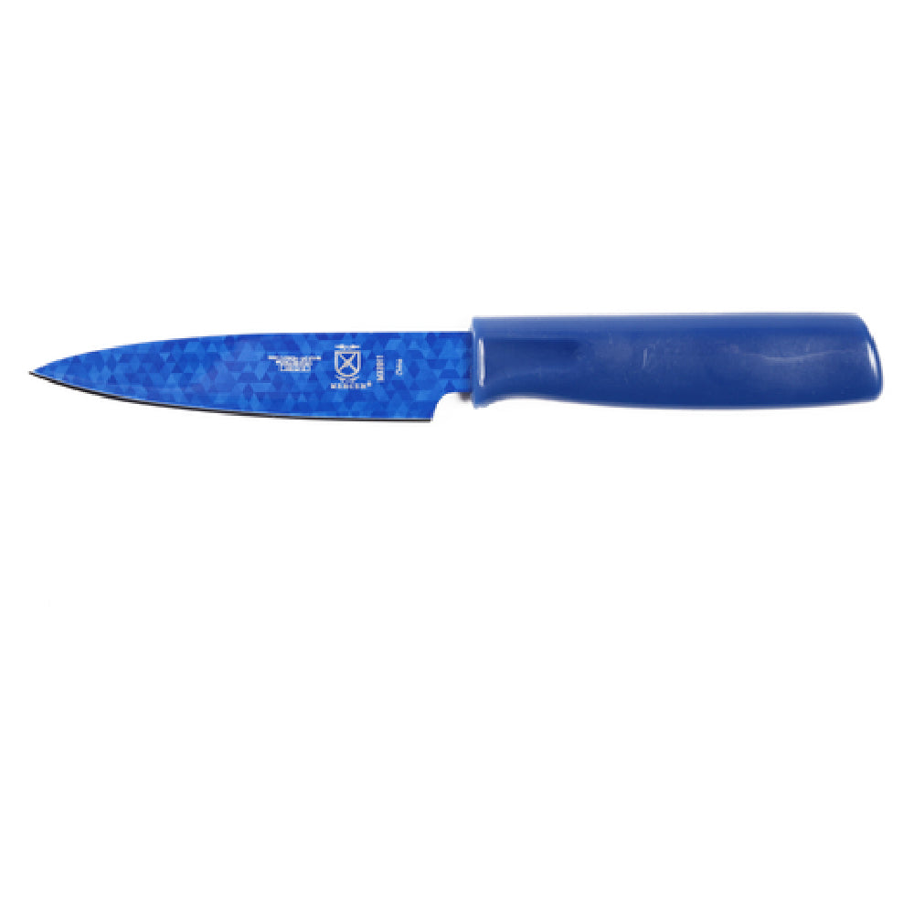 The Mercer Culinary M33911B Paring Knife 4" High Carbon is a precision instrument designed for culinary professionals and home chefs seeking superior performance and durability. Crafted with meticulous attention to detail, this paring knife features a 4-inch high-carbon, stain-resistant Japanese steel blade, delivering exceptional sharpness and longevity. The blade is further enhanced with a non-stick coating, ensuring smooth, seamless cutting and easy cleaning, making it a highly efficient tool for intricate tasks like peeling, trimming, and garnishing. Accompanied by an ergonomic ABS handle, the knife offers a comfortable and secure grip, minimizing hand fatigue during extended use. The inclusion of a protective sheath adds an additional layer of safety, making it convenient for storage and transport. The vibrant blue color of the handle not only adds a touch of style but also allows for easy identification in a busy kitchen environment. Whether you're a professional chef in a bustling restaurant or a cooking enthusiast at home, the Mercer Culinary M33911B Paring Knife stands out as a reliable and versatile choice, blending traditional craftsmanship with modern innovation to enhance your culinary experience.