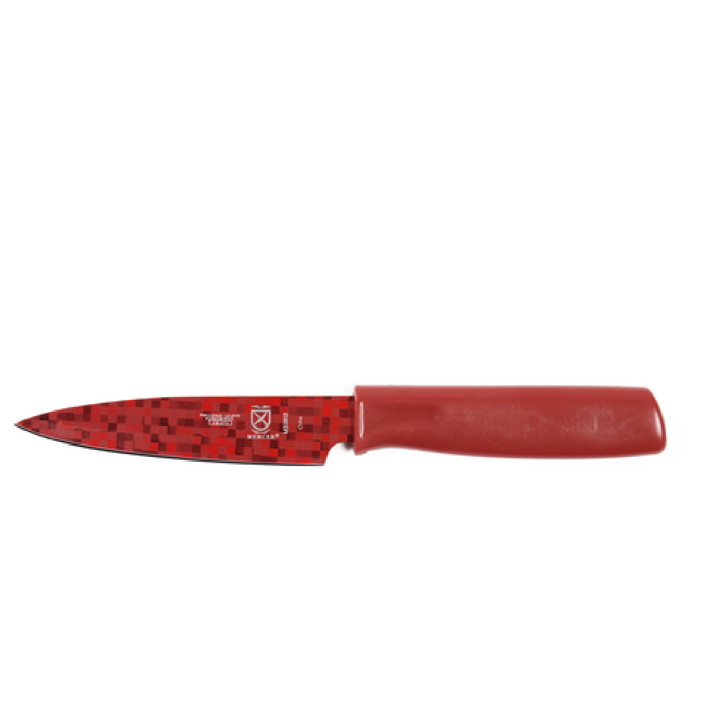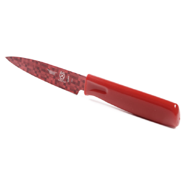 The Mercer Culinary M33912B Paring Knife 4" High Carbon is a precision instrument designed for culinary enthusiasts and professionals alike. Its 4-inch blade is crafted from high carbon Japanese steel, known for its exceptional durability and stain resistance, making it a reliable choice for meticulous kitchen tasks. The blade is enhanced with a non-stick coating, ensuring smooth, effortless cutting and easy maintenance. This paring knife features an ergonomic ABS handle, providing a comfortable and secure grip that reduces hand fatigue during extended use. Accompanied by a protective sheath, this knife is not only efficient but also designed for safe storage and transport. The vibrant red color adds a distinctive touch, making it easy to identify in a busy kitchen environment. The Mercer Culinary M33912B Paring Knife is an invaluable tool for precise peeling, trimming, and slicing, catering to the needs of both home cooks and professional chefs who demand quality and performance in their kitchen utensils. Its combination of innovative features and reliable construction positions it as a versatile asset in any culinary setting, emphasizing efficiency and longevity.