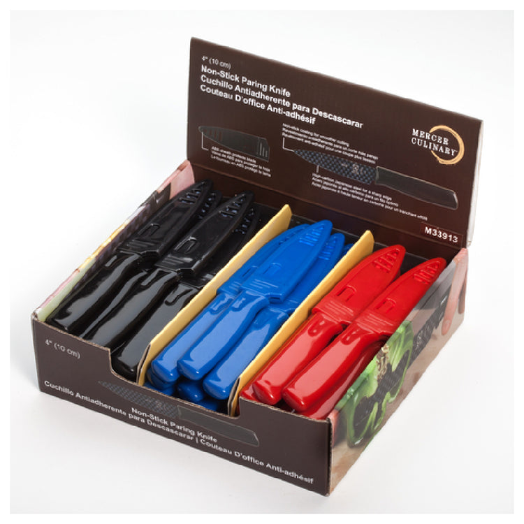 The Mercer Culinary M33913 Paring Knife 4" is meticulously crafted to serve the needs of culinary professionals and home cooks alike, featuring a high-carbon, stain-resistant Japanese steel blade. This precision tool is designed to provide exceptional performance, boasting a non-stick coating that reduces friction for smoother, more precise cuts. The ergonomic ABS handle ensures comfort and control, reducing hand fatigue even with extended use. Each knife is accompanied by a protective sheath, enhancing safety and convenience in storage. Available in three distinct colors—black, blue, and red—this paring knife offers both functionality and aesthetic versatility. With a total of 36 knives per display box, comprising twelve of each color, the Mercer Culinary M33913 is ideally suited for large-scale culinary environments such as professional kitchens and cooking schools. Its high-quality construction and thoughtful design make it a reliable and essential tool for tasks ranging from intricate peeling to precise slicing. The combination of superior materials and practical features ensures that this paring knife meets the rigorous demands of various market segments within the culinary industry, providing a balanced blend of durability, efficiency, and style.