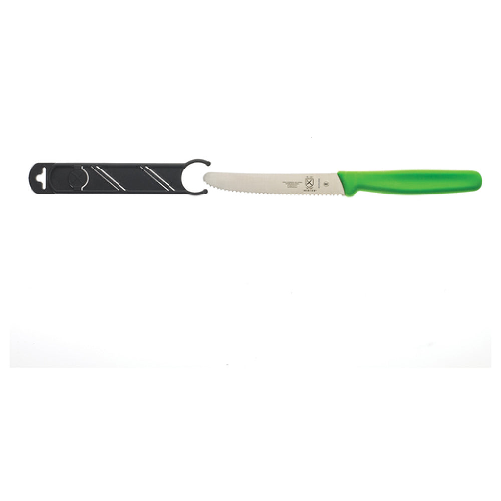 The Mercer Culinary M33932GRB Bar Knife 4-1/3" Serrated Edge is a meticulously designed cutting tool that blends precision and durability, catering to diverse culinary environments. This bar knife features a 4-1/3-inch serrated edge, crafted to effortlessly handle a variety of ingredients, making it indispensable for cocktail preparation and garnishing tasks. The blade is constructed from high carbon Japanese stainless steel, renowned for its exceptional sharpness and resistance to corrosion, ensuring long-lasting performance in demanding settings. The rounded tip enhances safety during use, a critical feature for fast-paced bar and kitchen operations. The knife is equipped with a textured polypropylene handle, providing a secure grip even in wet conditions, and is colored green for easy identification among kitchen tools. Additionally, the slide-on guard offers added protection for safe storage and transport. Certified by NSF, this bar knife meets rigorous public health and safety standards, making it suitable for use in professional settings. Ideal for bartenders, chefs, and caterers, the Mercer Culinary M33932GRB Bar Knife offers a blend of functionality, safety, and compliance, making it a reliable choice for precise cutting tasks in various culinary applications.
