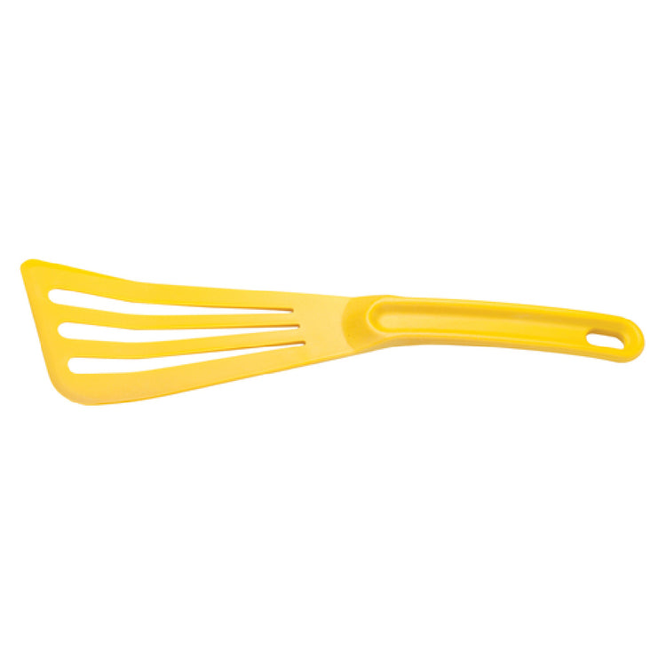 The Mercer Culinary M35110YL Hell's Tools® Spatula 3-1/2" X 12" Overall Size Slotted is a highly specialized culinary instrument designed for professional kitchen environments. Featuring a slotted and flexible blade, this spatula is crafted to optimize performance in various cooking applications, providing a seamless experience for chefs across different culinary disciplines. The blade's beveled edge allows for precise and efficient handling of food items, enhancing the user's control and precision. Constructed from high-temperature, impact-resistant nylon, this spatula is rated to withstand temperatures up to 430°F, ensuring durability and resilience in high-heat cooking scenarios. Its vibrant yellow color not only adds a splash of color to the kitchen but also aids in quick identification among other utensils. Certified by NSF, this spatula meets rigorous public health and safety standards, making it a reliable choice for commercial kitchens. With an overall size of 3-1/2" x 12", it balances versatility and functionality, catering to the needs of both small-scale artisanal chefs and large-scale food service operations. The Mercer Culinary M35110YL Hell's Tools® Spatula stands out in the culinary utensil market by combining exceptional heat resistance with ergonomic design, making it indispensable for professional chefs and culinary enthusiasts alike.