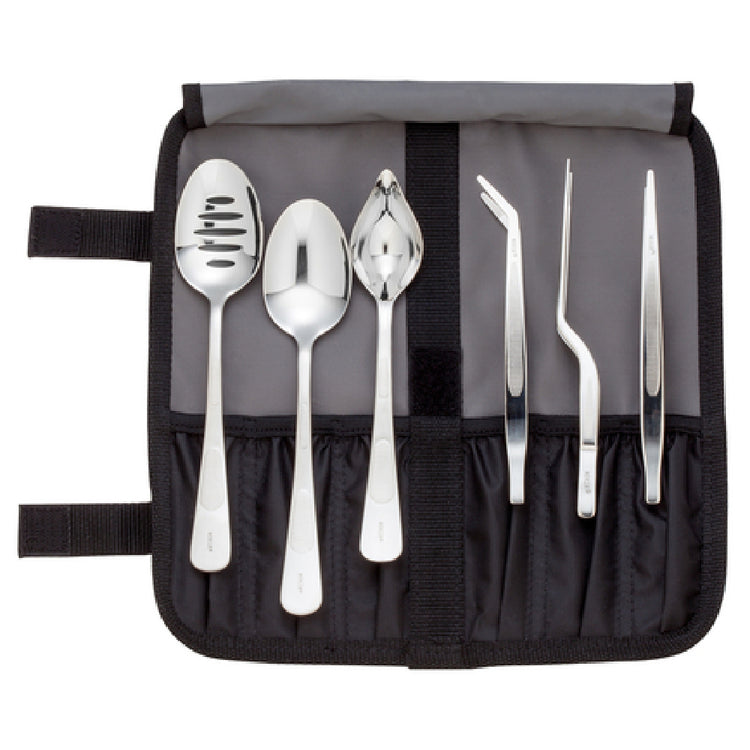 The Mercer Culinary M35153 Basics Plating Set is a comprehensive 7-piece collection meticulously crafted for culinary professionals seeking precision and versatility in food presentation. This set includes a range of essential tools designed to enhance the plating experience. The M35143 petite saucer spoon offers refined control for delicate sauce applications, while the M35140 7-7/8" solid spoon and M35141 7-7/8" slotted spoon provide robust options for serving and straining. The inclusion of the M35135 6-1/8" straight tong ensures precise handling, complemented by the M35134 6-1/8" fine point curved tong for intricate placements. The M35136 6-1/2" offset tong allows for ergonomic maneuvering. All components are housed in the M30920 heavy-duty 6-compartment roll for organized and portable storage. This set is tailored to meet the diverse needs of chefs, whether in a bustling restaurant kitchen or a fine dining establishment, promising efficiency and precision in every plating task.