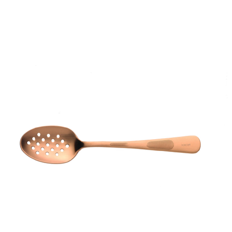 The Mercer Culinary M35161RG Plating Spoon 7-7/8"L Perforated is a specialized tool designed for precision in culinary presentation. This spoon stands out with its perforated deep well bowl, allowing chefs to easily drain liquids while plating, enhancing the presentation of dishes. The dual micro-serration feature offers enhanced grip and control, ensuring that chefs can handle delicate foods with confidence. Constructed with an 18/8 stainless steel core, this plating spoon is both durable and resistant to rust and corrosion, making it a long-lasting addition to any professional kitchen. The mirror finish of the bowl reflects a dedication to aesthetic appeal, ensuring each plating experience is as visually pleasing as it is functional. Complementing this is the satin finish handle, providing a comfortable grip that reduces hand fatigue during intricate plating sessions. The spoon's elegant rose gold finish adds a touch of sophistication, making it not only a tool but also a statement piece for culinary professionals. Ideal for both high-end restaurants and catering services, the Mercer Culinary M35161RG offers unparalleled precision and style, catering to chefs who value both functionality and design in their kitchen tools.