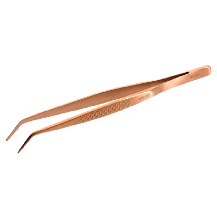 The Mercer Culinary M35244RG Precision Plus™ Tongs 6-1/8" L Fine Point is a meticulously crafted tool designed for precision and stability in culinary activities. Measuring 6-1/8 inches in length, these tongs feature a fine point with a curved tip style, making them ideal for delicate and intricate food presentations. The dual raised cross-hatch grips on the outside provide enhanced stability, ensuring a secure hold even in busy kitchen environments. The inside serrated tips further augment grip, allowing for precise handling of small and slippery ingredients. Constructed with a hardened 18/8 stainless steel core, these tongs offer exceptional durability and resistance to wear, complemented by a satin finish that adds a touch of elegance. The rose gold color not only enhances the aesthetic appeal but also adds a modern flair, making it suitable for upscale dining establishments or any professional kitchen setting. This product stands out as a versatile choice for chefs and culinary enthusiasts seeking a reliable and stylish tool for precise food handling.