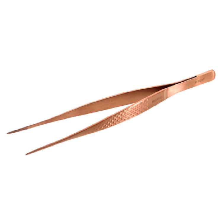 The Mercer Culinary M35245RG Precision Plus™ Tongs 6-1/8" L Fine Point are meticulously crafted for culinary professionals who demand precision and reliability. These tongs measure 6-1/8 inches in length, providing an ideal size for intricate tasks in the kitchen. The fine point and straight style make them perfect for delicate operations, such as plating or handling small garnishes. Featuring dual raised cross-hatch grips on the outside, these tongs ensure stability and control during use. The inside serrated tips offer a secure grip on food items, minimizing slips and enhancing precision. Constructed from hardened 18/8 stainless steel, the tongs boast a robust core that promises durability and longevity under frequent use. The satin finish not only adds a touch of elegance but also ensures easy cleaning and maintenance. The rose gold color enhances their aesthetic appeal, making them a stylish addition to any kitchen. These tongs are especially valuable for chefs and culinary artists seeking tools that blend functionality with style, making them suitable for a range of market segments, from fine dining establishments to modern culinary schools. The Mercer Culinary Precision Plus tongs stand out for their blend of precision, durability, and aesthetic appeal.