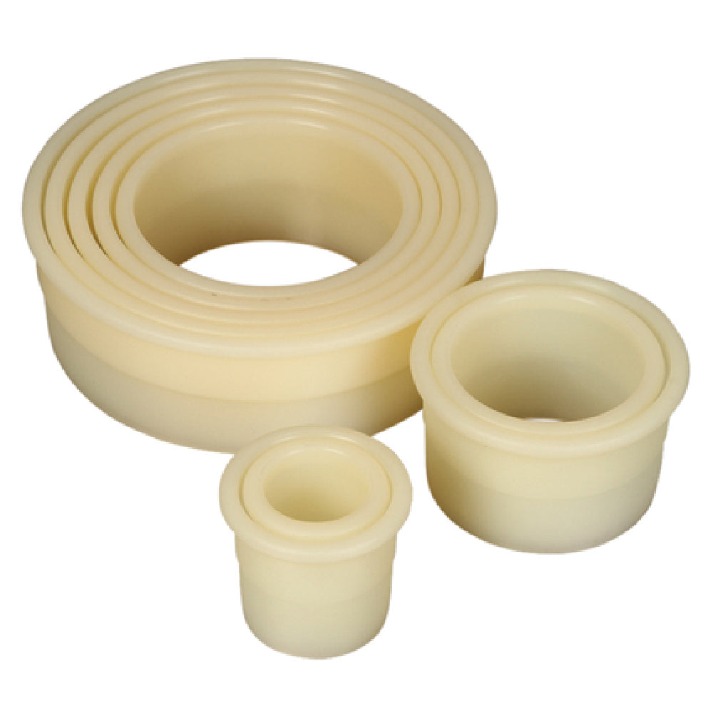 The Mercer Culinary M35502 Cutter Set 9 Piece Plain is a versatile tool designed for precision and efficiency in culinary tasks. This set includes nine cutters ranging in size from 3 cm to 11 cm, catering to a wide array of culinary applications. Each cutter is 1-3/8 inches high and features a round shape with a rounded top edge, enhancing ease of use and safety during operation. Constructed as a one-piece unit from glass-reinforced nylon, these cutters boast a durable and lightweight design, complemented by a beveled cutting edge that ensures clean and precise cuts. The cutter set is dishwasher safe, providing convenience and maintaining high hygiene standards in busy kitchen environments. For organizational purposes, the set comes with a plastic storage box that ensures safe and efficient storage. With 12 sets per case, it is ideal for bulk purchasing needs, whether for professional kitchens, culinary schools, or catering companies. The Mercer Culinary M35502 Cutter Set showcases a unique value proposition in its combination of robust construction and practical design, making it a reliable choice across multiple segments of the culinary industry where precision and durability are paramount.