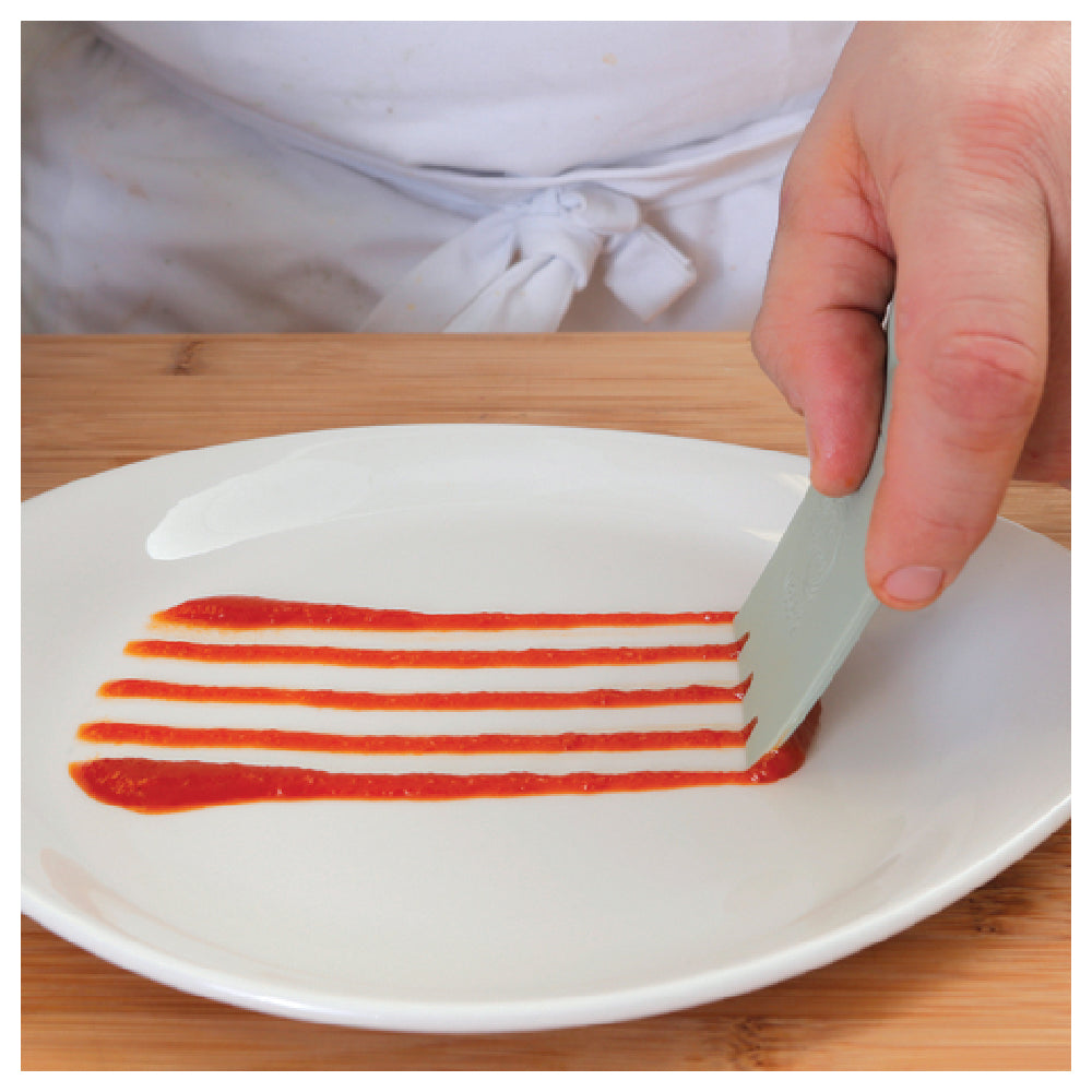 The Mercer Culinary M35612 Silicone Plating Wedge is a precision tool designed for culinary professionals seeking to enhance their plating techniques. This innovative wedge features a 4mm square notch and measures 3/4" x 2-1/2" in overall dimensions, with a 2-1/4" wide wedge tip, making it ideal for creating intricate designs and patterns on plates. Crafted from food-safe silicone, this plating wedge is heat resistant up to 480°F (250°C), ensuring durability and reliability in high-temperature environments. Its recessed thumb rest provides enhanced control and comfort during use, while the color-coded design aids in easy identification among other utensils. The tapered end allows for seamless application of sauces and purees, catering to the intricate demands of the culinary industry. Equipped with a convenient hanging hole, this tool can be easily stored, ensuring kitchen organization. Additionally, it is dishwasher safe, simplifying the cleaning process and maintaining hygiene standards. Sold in cases of 12, the Mercer Culinary M35612 Silicone Plating Wedge is an essential asset for chefs and culinary artists aiming to achieve precision and creativity in their presentations, offering unique value across different market segments within the food service industry.