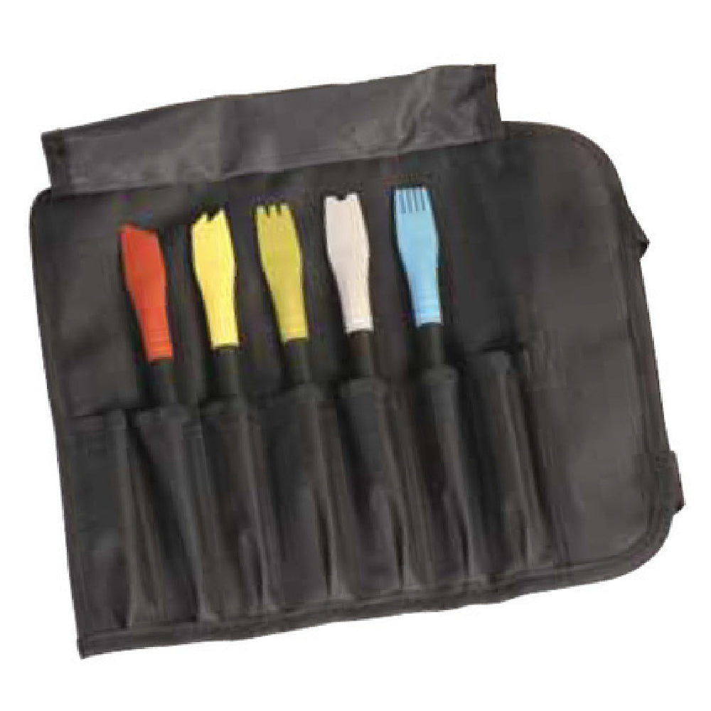 The Mercer Culinary M35615 Silicone Brush Set is a comprehensive 6-piece collection designed for precision and versatility in culinary applications. This set includes the M35601 60° angle brush, perfect for intricate pastry work or applying sauces with accuracy. Each piece in the set serves a distinct purpose: the M35602 comb brush aids in creating textured surfaces; the M35603 saw tooth brush is ideal for unique culinary presentations; the M35604 5mm round arch offers gentle application on delicate surfaces; and the M35605 3mm lancet arch ensures fine detailing. For organized storage and easy portability, the set includes the M30307 heavy-duty 6-compartment roll. This brush set is tailored to meet the diverse needs of culinary professionals, from pastry chefs to grill masters, by providing a tool for every detail-oriented task. The silicone construction ensures durability and ease of cleaning, while the variety of brush designs empowers chefs to explore creative techniques and elevate their culinary creations. Whether in a bustling restaurant kitchen or a small artisanal bakery, the Mercer Culinary M35615 Silicone Brush Set delivers precision and reliability, making it an essential addition to any chef’s toolkit.