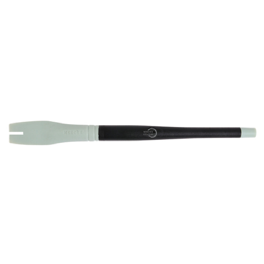 The Mercer Culinary M35617 Plating Brush is a precision tool designed for culinary professionals seeking to elevate their plating artistry. This brush features a 2mm square notch, ideal for creating intricate designs and textures on various dishes. With an overall length of 7-5/8 inches, it provides ample reach and control for detailed work. The brush head measures 3/4 inches in width and is crafted from food-safe silicone, capable of withstanding temperatures up to 480°F (250°C). This ensures it remains functional even in high-heat environments. The tapered handle is made from high-temperature nylon and features a textured surface for enhanced grip, reducing the risk of slips during use. Color-coded elements on the brush head and handle tip facilitate easy identification and organization in busy kitchen settings. Additionally, the brush is dishwasher safe, ensuring easy and efficient cleaning, which is crucial in maintaining hygiene standards. The Mercer Culinary M35617 Plating Brush is a versatile tool for chefs in fine dining, catering, and any culinary field where presentation is key, offering a blend of durability, precision, and convenience that aids in the creation of visually stunning culinary presentations.