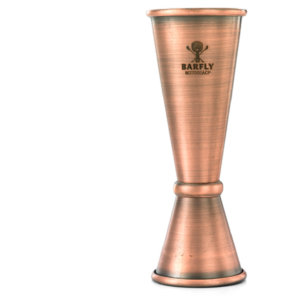 The Mercer Culinary M37005ACP Barfly® Japanese Style Jigger 1 & 2 Oz. With Internal Marking Lines is an essential tool for mixologists seeking precision and style in one sleek package. This jigger boasts a dual-capacity design, featuring a 1 oz. and a 2 oz. measurement, catering to the diverse needs of bartending professionals. Crafted from an 18/8 stainless steel core, it provides durability and resistance to corrosion, ensuring a long-lasting, reliable performance. The antique copper-plated finish not only adds a touch of vintage elegance but also enhances grip and handling. Its internal marking lines offer precise measurement, supporting consistent cocktail preparation, an essential feature for both novice and seasoned bartenders aiming for accuracy. This jigger's design reflects the Japanese style, known for its balance and ergonomics, making it an ideal choice for high-volume bars, speakeasies, or home enthusiasts looking to elevate their cocktail crafting experience. The Mercer Culinary M37005ACP combines functionality and aesthetic appeal, providing a unique value proposition within the barware industry, appealing to both professional mixologists and cocktail aficionados alike.