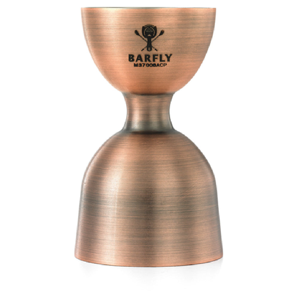 The Mercer Culinary M37006ACP Barfly® Straight Rim Jigger 1 & 2 Oz. Heavy Duty is a meticulously crafted tool designed for precision and durability, appealing to both professional bartenders and home mixologists. This jigger features a one-piece construction with internal marking lines, ensuring accurate measurements for cocktail mixing. Made from an 18/8 stainless steel core, it promises exceptional strength and longevity, making it a reliable choice for high-volume environments. The antique copper-plated finish not only enhances its aesthetic appeal but also provides an additional layer of corrosion resistance, maintaining its sleek look over time. This dual-capacity jigger, offering 1-ounce and 2-ounce measurements, caters to versatile cocktail-making needs, making it ideal for both intricate cocktail recipes and straightforward pours. Its heavy-duty nature ensures stability and ease of use, reducing spillage and improving efficiency in a fast-paced setting. The Mercer Culinary M37006ACP Barfly® Straight Rim Jigger, with its blend of functionality and style, stands out as a valuable addition for those in the beverage industry seeking precision and elegance in their bar tools.