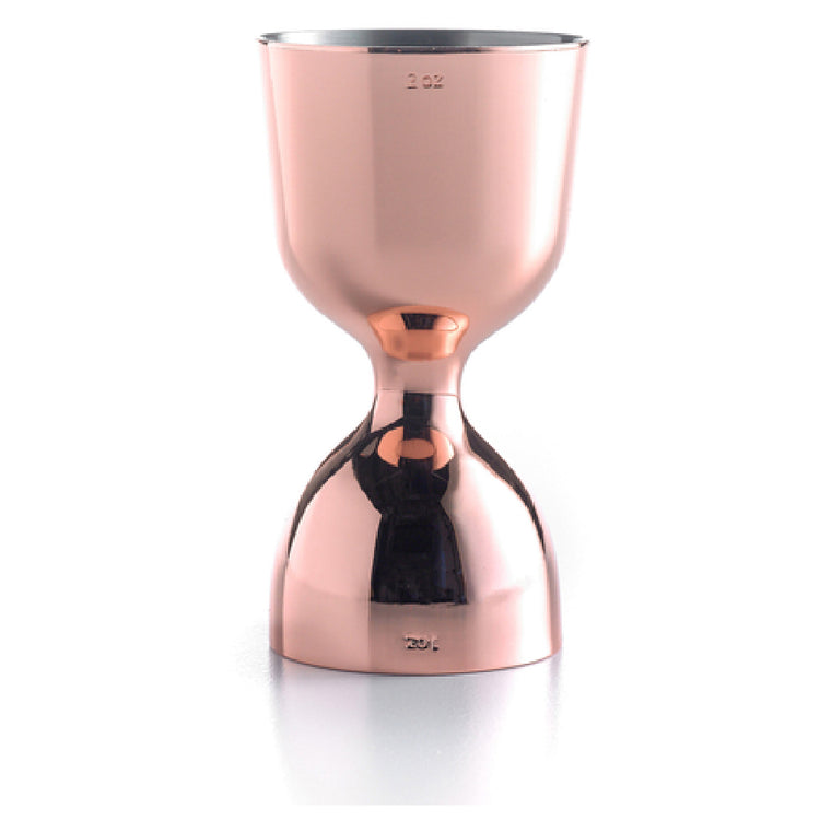 The Mercer Culinary M37006CP Barfly® Straight Rim Jigger 1 & 2 Oz. Heavy Duty is a meticulously crafted tool, essential for precision in mixology. This one-piece jigger, made from 18/8 stainless steel, ensures durability and long-lasting performance, making it perfect for both professional bartenders and home enthusiasts who value quality tools. Its copper-plated finish adds an elegant touch, marrying aesthetic appeal with functionality. Featuring internal marking lines, this jigger provides accurate measurements, crucial for crafting the perfect cocktail. The dual capacity of 1 and 2 ounces caters to a wide range of recipes, enhancing versatility. The heavy-duty construction signifies resilience, withstanding the demands of high-volume bar environments. Ideal for bars, restaurants, and home use, its polished design complements various decors and settings, while offering the precision required for consistent beverage preparation. This jigger is not only a testament to superior craftsmanship but also a functional piece that meets the stringent standards of professional culinary tools. Its unique value lies in its blend of robust materials and thoughtful design, which simplifies the art of measuring, making it a must-have for anyone serious about their craft in the beverage industry.