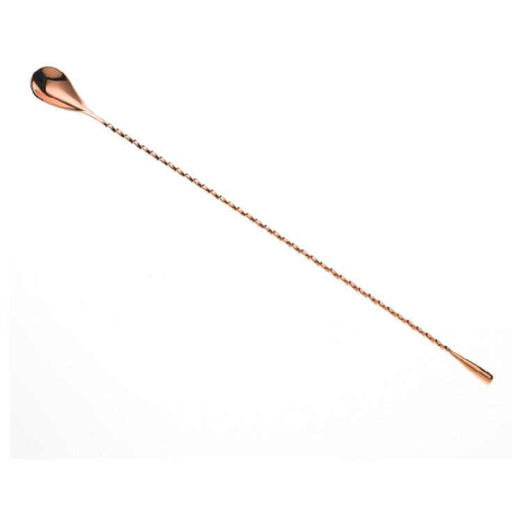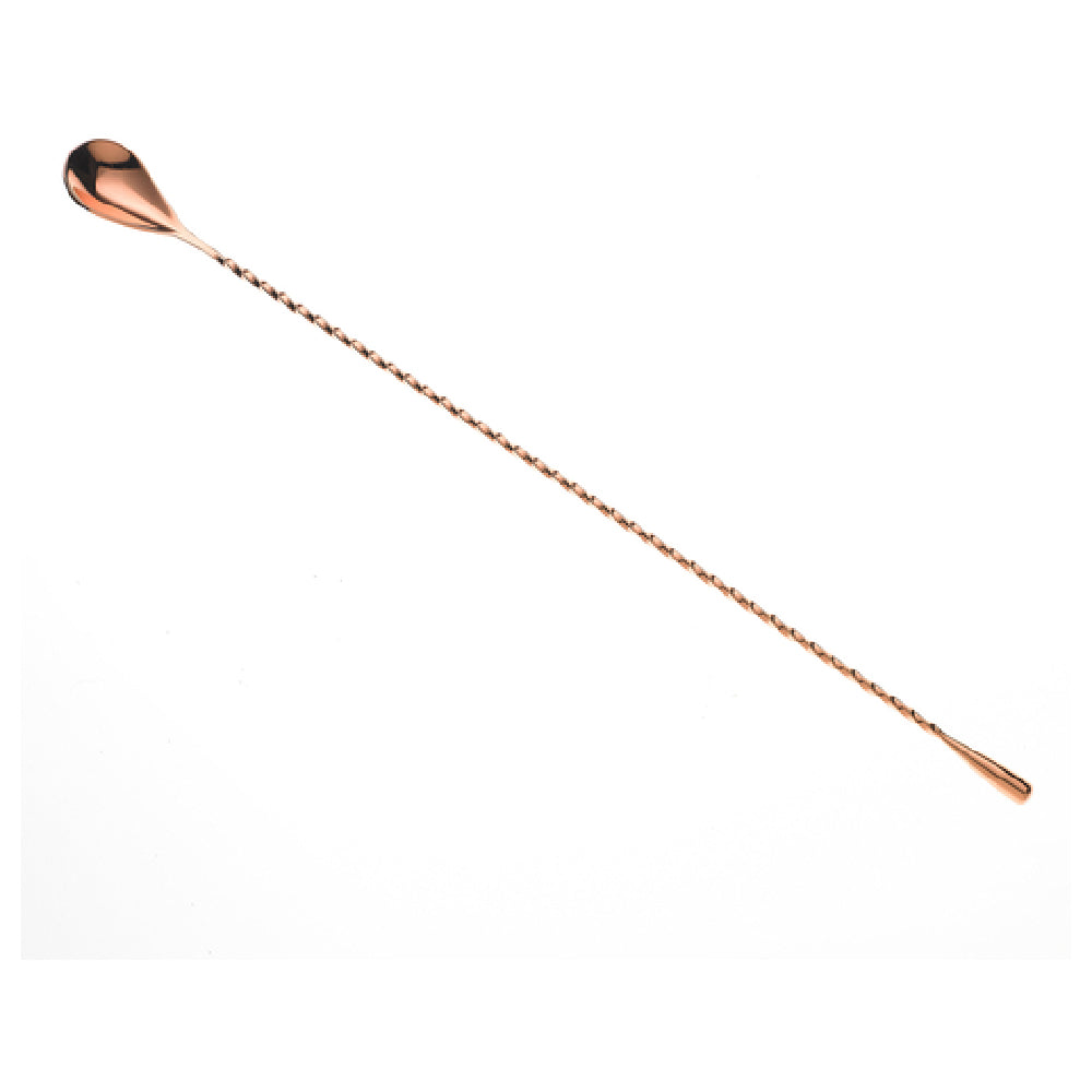 The Mercer Culinary M37013CP Barfly® Classic Bar Spoon 15-3/4" (40 Cm) Weighted Teardrop Shaped End stands out as a versatile tool for mixologists and bartenders in various market segments, from high-end cocktail bars to casual lounges. This bar spoon features a length of 15-3/4 inches (40 cm), providing ample reach for mixing in taller glasses and pitchers, a critical factor for professionals aiming for precision and efficiency in their craft. The weighted teardrop-shaped end offers enhanced control and balance, facilitating smooth stirring motions essential for creating perfectly blended drinks. Crafted from 18/8 stainless steel, the one-piece construction of this bar spoon ensures durability and resistance to corrosion, a must-have for maintaining the quality and longevity of bar tools in high-traffic environments. The twisted stem adds a touch of elegance while also serving a functional purpose, allowing for an easy grip and preventing slippage during use. Furthermore, the copper-plated finish not only enhances the aesthetic appeal of this bar spoon, making it a striking addition to any bar setup but also aligns with the rising trend of copper barware. This combination of functional design and stylish appearance makes the Mercer Culinary M37013CP Barfly® Classic Bar Spoon a valuable asset for professionals seeking both performance and sophistication in their bar tools.