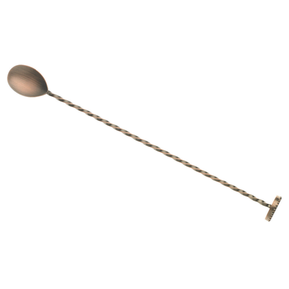 The Mercer Culinary M37018ACP Barfly® Bar Spoon With Muddler 11-13/16" (30 Cm) is a precision-crafted tool tailored for professional bartenders and cocktail enthusiasts alike. Engineered with a one-piece construction, this bar spoon is made from 18/8 stainless steel, ensuring durability and resistance to corrosion. Its distinctive antique copper-plated finish not only adds a touch of elegance but also complements a variety of bar settings, from modern to classic. Featuring a twisted stem, the spoon provides enhanced grip and control, facilitating seamless stirring of mixed drinks. The flat-top end doubles as a muddler, offering versatility by enabling bartenders to crush ingredients directly in the glass, enhancing flavor integration in cocktails. Measuring exactly 11-13/16 inches (30 cm) in length, the spoon is perfectly sized for reaching the bottom of tall glasses or cocktail shakers, ensuring efficient mixing without compromising the drink's integrity. This meticulously designed bar spoon embodies the perfect blend of function and style, making it an indispensable tool for crafting sophisticated cocktails across different segment markets within the beverage industry.