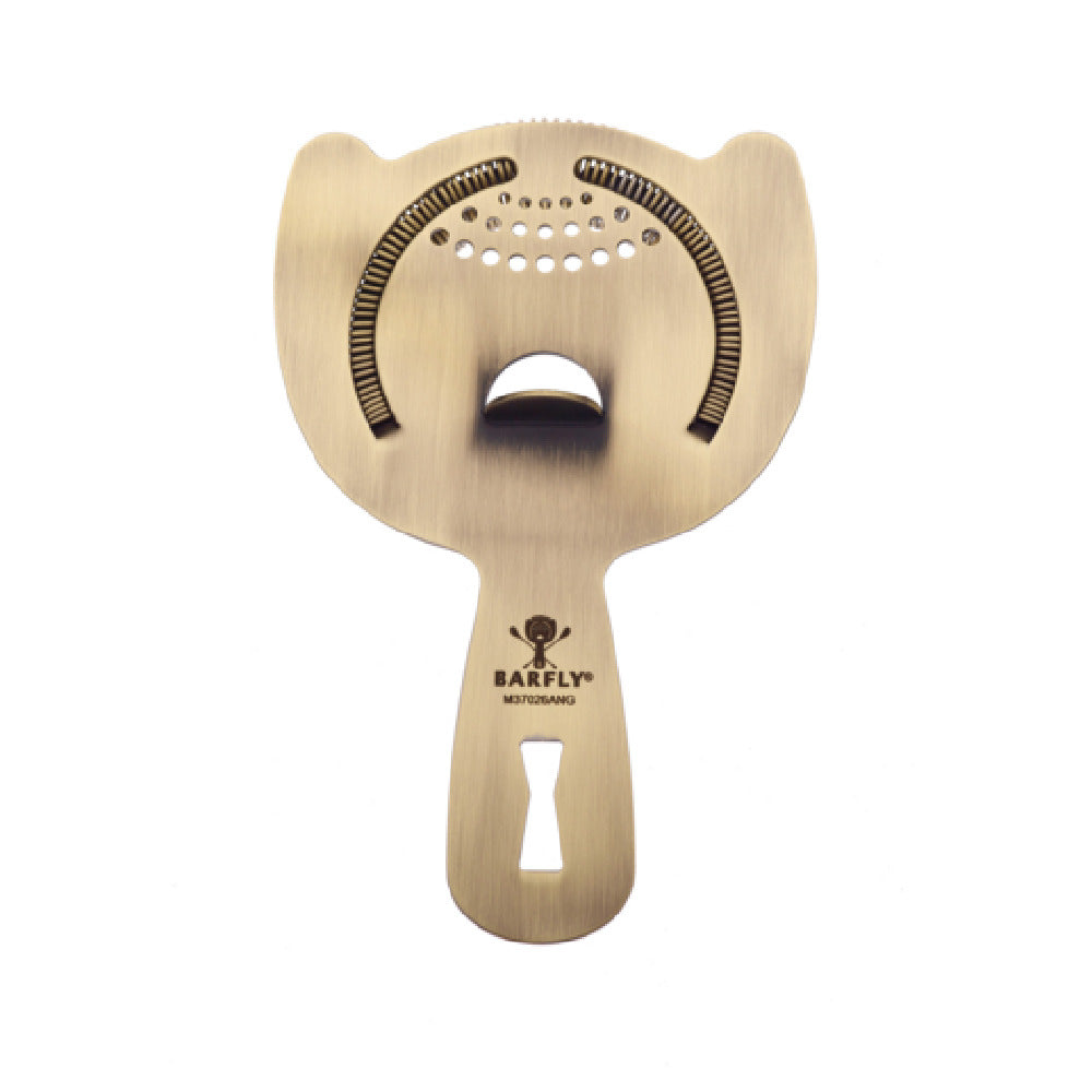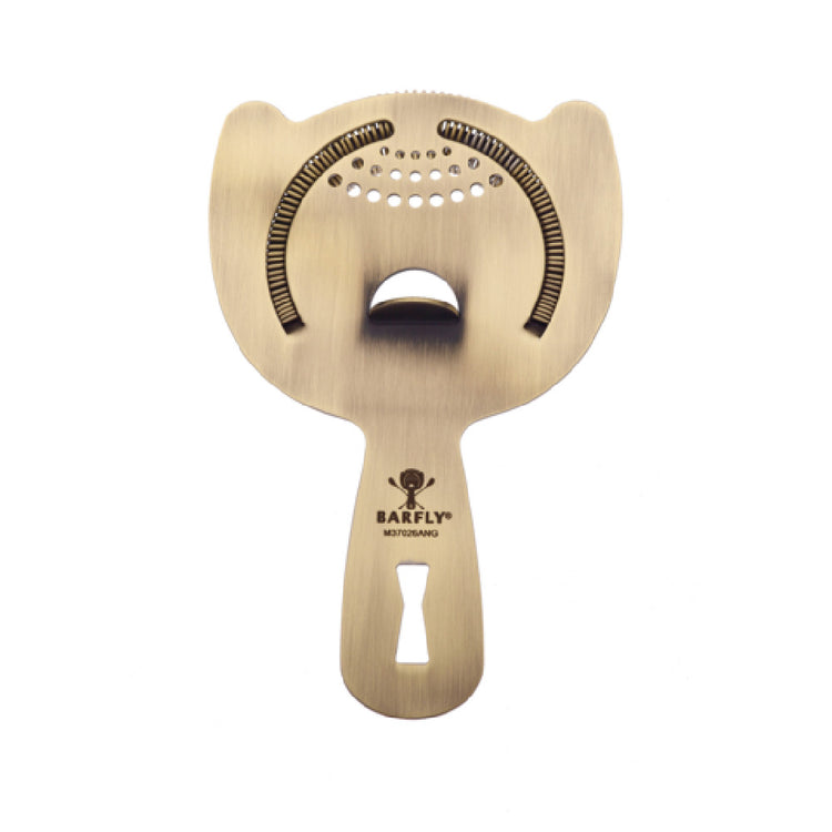 The Mercer Culinary M37026ANG Barfly® Spring Bar Strainer is a high-quality tool designed for professional bartenders and cocktail enthusiasts. Measuring 6 inches in overall length, this heavy-duty strainer is crafted with a 2-prong design, ensuring stability and precision during use. A standout feature is its replaceable spring, which enhances longevity and allows for easy maintenance, making it a cost-effective choice for busy bars. The strainer is equipped with a hanging hole, facilitating convenient storage and accessibility in fast-paced environments. Constructed from an 18/8 stainless steel core, it ensures durability and resistance to corrosion, essential for withstanding the rigors of frequent use. The Antique Gold-plated finish not only adds a touch of elegance and sophistication but also enhances the visual appeal, making it a stylish addition to any bar setup. This product is suitable for various segments within the hospitality industry, from high-end cocktail bars seeking a blend of functionality and aesthetics to casual venues looking for reliable and efficient bar tools. The Mercer Culinary M37026ANG Barfly® Spring Bar Strainer combines practical design with superior craftsmanship, catering to the diverse needs of the beverage service sector.