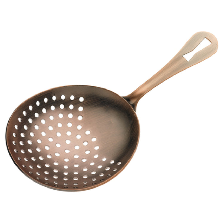 The Mercer Culinary M37028ACP Barfly® Julep Strainer is a meticulously crafted utensil with a 6-1/2-inch overall length, designed to enhance the bartending experience. Its welded handle is thoughtfully integrated with a hanging hole, offering convenience in storage and accessibility. Made from a durable 18/8 stainless steel core, this strainer is both robust and resilient, ensuring long-lasting performance. The exterior is plated in antique copper, providing an elegant touch while adding a layer of corrosion resistance. This sophisticated finish makes it suitable for upscale bars and cocktail enthusiasts who appreciate both form and function. By combining a classic aesthetic with modern engineering, the Mercer Culinary M37028ACP stands out as a premium choice for professionals in the hospitality industry. Its design not only facilitates efficient straining during the crafting of julep cocktails but also complements various bar settings with its stylish appearance. Whether for use in high-volume commercial environments or at-home bartending setups, this julep strainer is a versatile tool that meets the demands of different market segments within the culinary industry. It represents a blend of traditional craftsmanship and contemporary utility, appealing to those who value quality barware.
