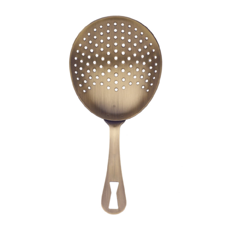 The Mercer Culinary M37028ANG Barfly® Julep Strainer is a meticulously crafted tool featuring a 6-1/2 inch overall length, designed for both professional bartenders and cocktail enthusiasts. This strainer is engineered with a welded handle that ensures durability and stability during use, complemented by a hanging hole for convenient storage. Crafted from an 18/8 stainless steel core, it promises exceptional strength and resistance to corrosion, making it a long-lasting addition to any barware collection. The Antique Gold-plated exterior not only adds an elegant touch to its appearance but also enhances its visual appeal, making it a standout piece in any setting. This combination of functional design and aesthetic appeal makes the Mercer Culinary M37028ANG Barfly® Julep Strainer an indispensable tool for those in the hospitality industry, enhancing the preparation and presentation of cocktails while reflecting a commitment to quality and style. Whether used in a bustling commercial bar or a refined home setting, its superior construction and classic design underscore its value as a versatile and reliable component of mixology equipment, catering to diverse market segments with its blend of practicality and sophisticated design attributes.