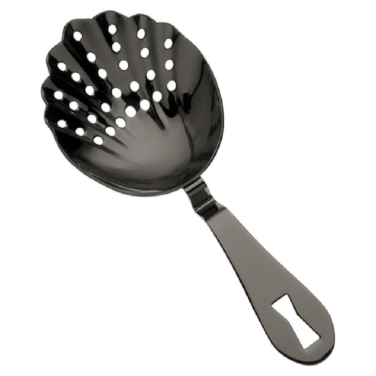 The Mercer Culinary M37029BK Barfly® Julep Strainer is expertly crafted for both professional mixologists and home bartenders. With a 7-inch overall length, this strainer is designed for precision and ease of use, ensuring it fits comfortably over most cocktail shakers and glasses. Its scalloped edges are not just aesthetically pleasing but functional, aiding in the efficient straining of ice and other solids from liquids. The welded handle provides a sturdy grip, and the inclusion of a hanging hole offers convenient storage options, maintaining an organized bar space. Made from 18/8 stainless steel, the strainer promises durability and resistance to corrosion, a must-have for high-volume bars where reliability is key. The gun metal black-plated finish not only adds a contemporary, sleek look but also enhances the tool's resilience, making it a stylish yet practical addition to any cocktail-making arsenal. The Barfly Julep Strainer is versatile, catering to different segment markets within the bar industry, from high-end cocktail lounges valuing design and functionality to busy bars requiring robust, efficient tools. Its combination of design, durability, and functionality ensures it meets the varied demands of professional settings and cocktail enthusiasts alike.
