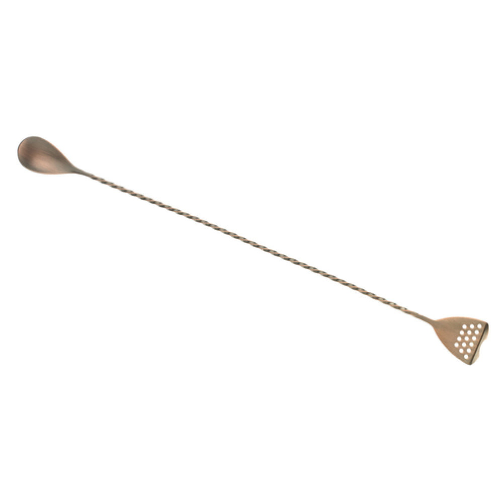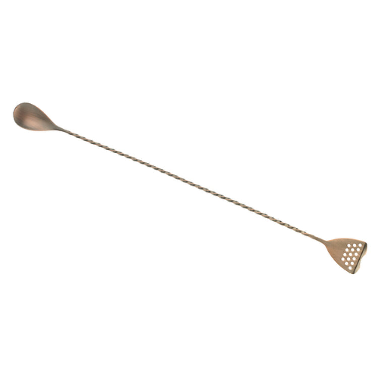 The Mercer Culinary M37072ACP Barfly® Bar Spoon 15-3/4" (40 Cm) Strainer End is a meticulously crafted bar tool designed for both professional bartenders and cocktail enthusiasts. Measuring 15-3/4 inches or 40 centimeters in length, this bar spoon combines functionality with elegance. It features a twisted stem that provides a secure grip, enhancing the precision and control needed for stirring and layering drinks. Constructed from an 18/8 stainless steel core, the spoon is both durable and resistant to corrosion, ensuring long-lasting performance even in high-volume settings. Its one-piece design adds to its structural integrity and ease of cleaning, making it an essential tool for busy bar environments. The antique copper-plated finish not only enhances its aesthetic appeal but also adds a touch of sophistication to any bar setup. The strainer end of the spoon offers added versatility, effectively doubling as a strainer to streamline the drink-making process. This bar spoon is a valuable addition to any professional or home bar, combining style and practicality for efficient cocktail preparation. The Mercer Culinary M37072ACP stands out in the barware market, offering a blend of classic design and modern utility that caters to the needs of diverse users.