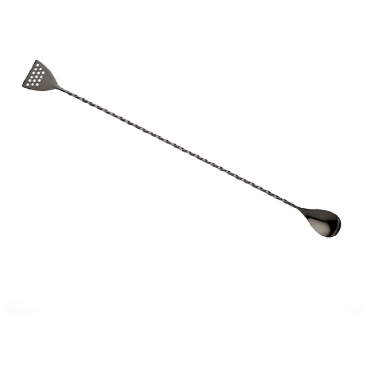 The Mercer Culinary M37072BK Barfly® Bar Spoon 15-3/4" (40 cm) Strainer End is a meticulously crafted tool, combining practicality with sophisticated design, tailored for the precise needs of bartenders and mixologists. This bar spoon is constructed from a one-piece 18/8 stainless steel core, ensuring durability and resistance to rust or corrosion, which is crucial for high-volume bars and home enthusiasts alike. The spoon features a gun metal black-plated finish, giving it a sleek, modern aesthetic that complements any bar setting. Its twisted stem is designed to facilitate seamless stirring, while the strainer end provides an added layer of functionality, allowing for efficient mixing and straining within the same tool. At 15-3/4" (40 cm) in length, this bar spoon is ideal for reaching the bottom of taller glassware or shakers, making it versatile across a range of cocktail preparations. The Mercer Culinary M37072BK Barfly® Bar Spoon is a perfect blend of form and function, suitable for both professional environments and personal use, ensuring a reliable performance with every use while adding a touch of elegance to the barware collection.