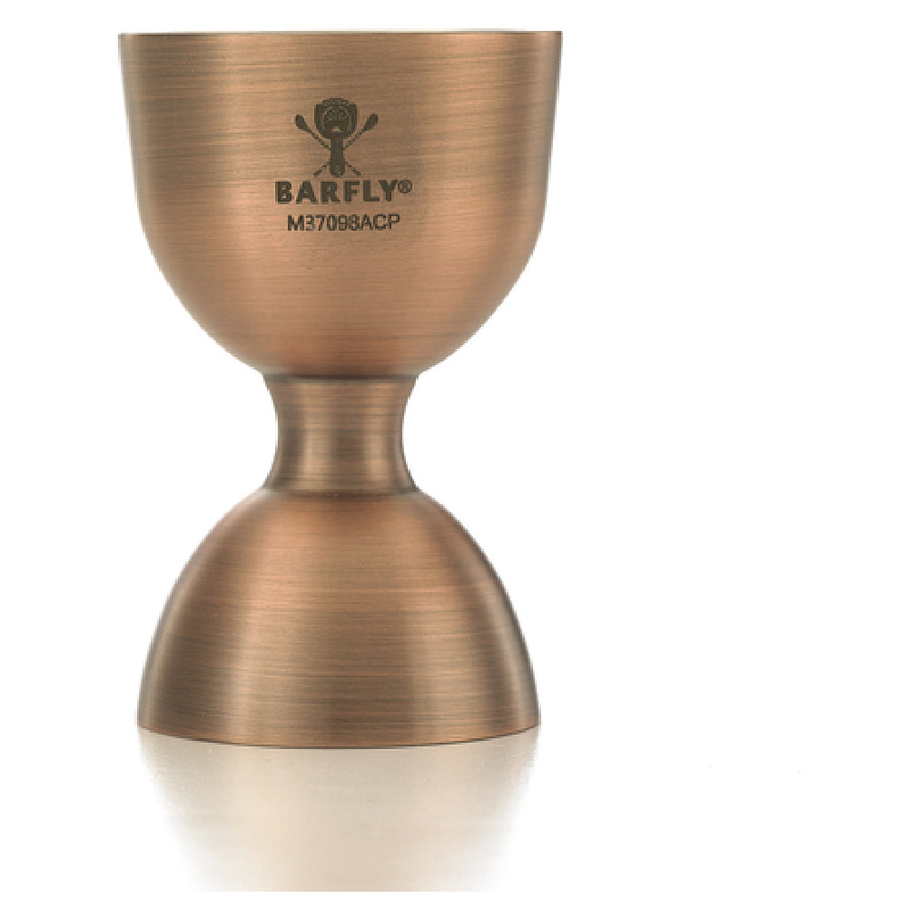 The Mercer Culinary M37098ACP Barfly® Straight Rim Jigger is a precision tool designed for the meticulous bartender, combining functionality with style. Featuring measurements of 25 ml and 50 ml (0.67 oz. and 1.69 oz.), this jigger is ideal for exact cocktail crafting. Constructed from 18/8 stainless steel, it boasts durability and resistance to corrosion, ensuring a long-lasting addition to any bar toolkit. The heavy-duty one-piece design enhances its robustness, making it suitable for high-volume environments where repeated use is common. With internal marking lines, bartenders can easily achieve precise pours, enhancing efficiency and consistency in drink preparation. The antique copper finish not only adds an aesthetic appeal but also provides a distinctive look that stands out in any bar setting. The Mercer Culinary Barfly® Straight Rim Jigger serves a dual function for both the professional bartender seeking reliability and precision, and the at-home mixologist looking to elevate their cocktail-making experience. Its technical specifications underline its high-quality construction and stylish design, making it a valuable asset in both commercial and residential settings within the hospitality industry.