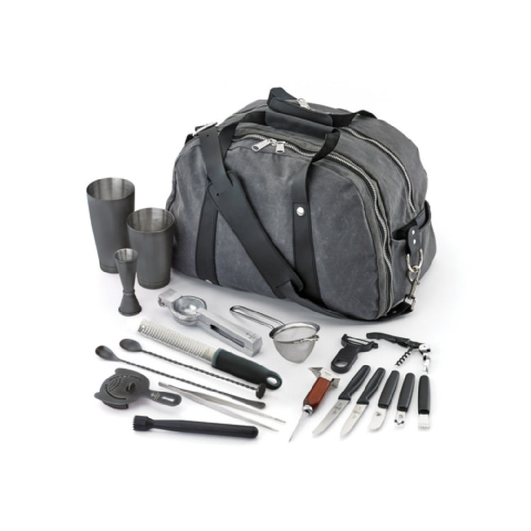 Mercer Culinary, M37103MBK, Barfly® Deluxe II Set, 18-piece, includes: (1) cocktail shaker set, (1) fine mesh strainer, (1) 9-3/8” Precision Plus™ straight tong, (1) 11-13/16” bar spoon with muddler end, (1) heavy-duty spring bar strainer, (1) 1 oz. x 2 oz. jigger, (1) 13-3/16” bar spoon, (1) black Y-peeler, (1) channel knife, (1) composite muddler, (1) ice pick, (1) cast aluminum juicer, (1) orange peeler, (1) citrus zester, (1) waiter’s corkscrew, (1) 4-1/3” rounded tip, wavy edge bar knife, (1) 4” pointed tip, plain edge bar knife, (1) narrow fine zester & (1) Barfly® Mixology Bag, 18/8 stainless steel core, matte black-plated finish