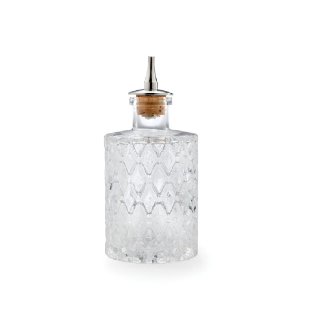 The Mercer Culinary M37187 Barfly® Bitters Bottle 5.1 Oz. (150 Ml.) Retro Styling is an elegantly designed glass container, ideal for precision dispensing of bitters in professional and home bar settings. With dimensions of 2-3/8 inches in diameter and a height of 5 1/2 inches, this bottle is perfect for easy handling and storage. Its retro styling adds a nostalgic touch to any bar setup. The bottle features a stainless steel dasher top equipped with a cork, ensuring a controlled pour and preserving the contents' freshness. This combination of materials not only enhances the bottle's aesthetic appeal but also provides durability and functionality, making it a dependable choice for mixologists and cocktail enthusiasts. The Mercer Culinary M37187 Barfly® Bitters Bottle is particularly valuable for those in the food and beverage industry who appreciate the importance of precision and presentation in crafting the perfect cocktail. Whether used in a high-end cocktail bar or a home mixology setup, its unique blend of style and practicality ensures it stands out as a functional piece of barware.