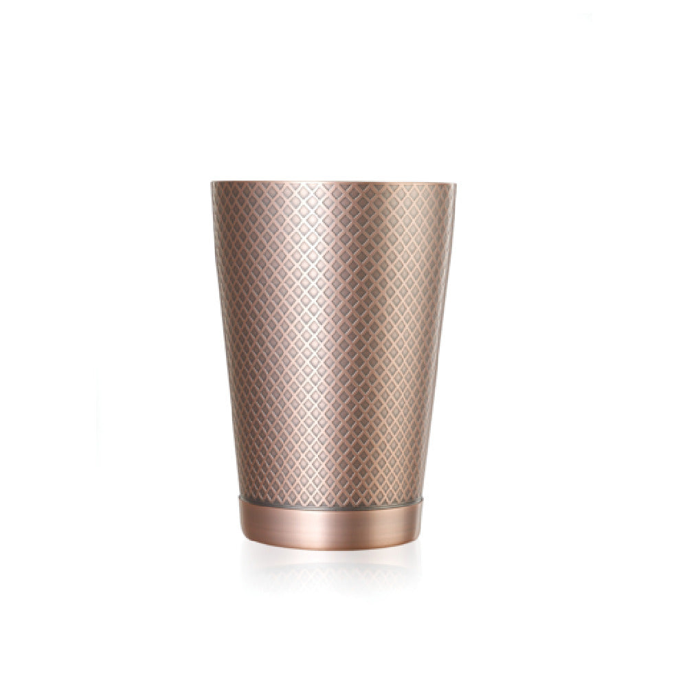 The Mercer Culinary M37198ACP Barfly® Diamond Lattice Shaker is an exceptional piece designed for professional bartenders and mixologists seeking superior quality and aesthetic appeal. With an 18 oz. capacity, this shaker measures 3-1/2" in diameter and stands 5" tall, making it a convenient size for various cocktail creations. The shaker features a capped bottom, contributing to its stability during use. Constructed with an 18/8 stainless steel core, it ensures durability and resistance to corrosion, which is essential for long-term use in a high-paced bar environment. The interior boasts a satin finish, enhancing its visual appeal while providing a smooth surface for seamless mixing. The exterior is antique copper-plated, exuding a classic and sophisticated look that complements any bar setting. Additionally, the intricate etched pattern design on the exterior not only adds to its aesthetic value but also provides a unique texture that facilitates a secure grip. This shaker is ideal for upscale bars, restaurants, or home enthusiasts who appreciate fine craftsmanship and functionality in their barware. Its blend of timeless design and robust construction makes the Mercer Culinary M37198ACP a distinguished choice for those committed to excellence in the art of cocktail making.