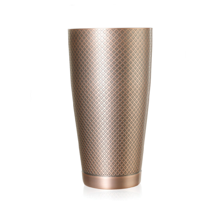 The Mercer Culinary M37199ACP Barfly® Diamond Lattice Shaker is a premium cocktail shaker with a capacity of 28 oz., making it an essential tool for bartenders and mixologists who value both functionality and style. With dimensions of 3-5/8" in diameter and 7" in height, this shaker offers a compact yet efficient design suitable for professional and home bars alike. The capped bottom ensures stability during use, while the 18/8 stainless steel core provides durability and resistance to corrosion. For a touch of elegance, the shaker features an antique copper-plated exterior, which not only enhances its aesthetic appeal but also adds a layer of sophistication to any bar setup. The intricate etched pattern design on the exterior further distinguishes this shaker, making it a unique statement piece. Inside, the satin finish ensures that the shaker is easy to clean and maintain, catering to the needs of busy environments. Ideal for a range of markets, from high-end cocktail bars to casual settings, the Mercer Culinary Diamond Lattice Shaker combines technical precision with artistic design, offering a versatile and attractive solution for crafting exceptional beverages.