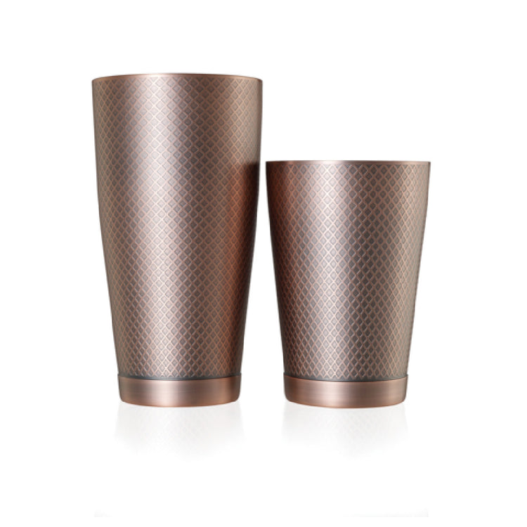 The Mercer Culinary M37200ACP Barfly® Diamond Lattice Cocktail Shaker Set is a premium option for mixologists and cocktail enthusiasts looking to elevate their craft. This set includes two shakers of 28 oz. and 18 oz. capacities, catering to diverse mixing needs. Crafted from an 18/8 stainless steel core, these shakers promise durability and resistance to corrosion, essential for maintaining high-quality standards in busy environments. The antique copper-plated exterior finish, complemented by an intricate etched pattern design, not only enhances visual appeal but also adds a touch of sophistication to any bar setting. Inside, a satin finish provides a smooth surface, ensuring that the mixing process is seamless and precise. The capped bottom design further reinforces the structural integrity, making it a reliable choice for professionals and amateurs alike. This cocktail shaker set is a blend of functionality and aesthetic, ideal for upscale restaurants, bars, and home use where both performance and style are paramount. The Mercer Culinary M37200ACP Barfly® Diamond Lattice Cocktail Shaker Set stands out with its unique combination of technical excellence and elegant design, meeting the needs of various market segments within the hospitality industry.