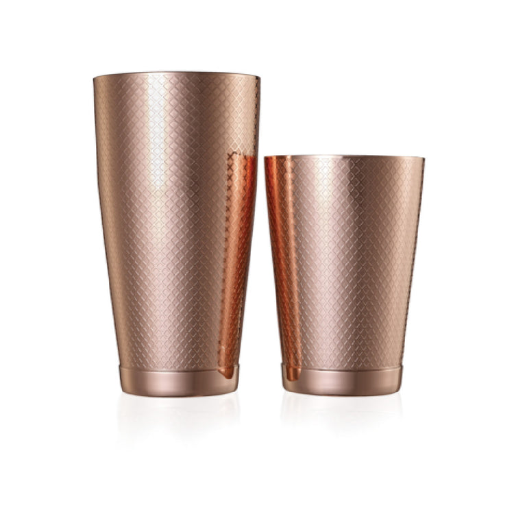 The Mercer Culinary M37200CP Barfly® Diamond Lattice Cocktail Shaker Set is a sophisticated and essential tool for mixologists and cocktail enthusiasts, featuring two shakers - one with a 28 oz. capacity and another with an 18 oz. capacity. Crafted from high-quality 18/8 stainless steel, the set boasts a satin finish interior that ensures durability and ease of cleaning. The eye-catching copper-plated exterior provides a luxurious look, enhanced by an intricate etched pattern design that combines both aesthetics and functionality. The capped bottom ensures stability and efficiency during shaking. This expertly designed cocktail shaker set is perfect for professional bartenders and home cocktail aficionados who value both style and performance. Its unique blend of technical precision and elegant design makes it a standout piece in any bar setting, offering a visually appealing experience while maintaining the highest standards of quality. Whether catering to an upscale bar environment or enhancing a home cocktail setup, the Mercer Culinary M37200CP Barfly® Diamond Lattice Cocktail Shaker Set delivers a unique value proposition that is both practical and luxurious.