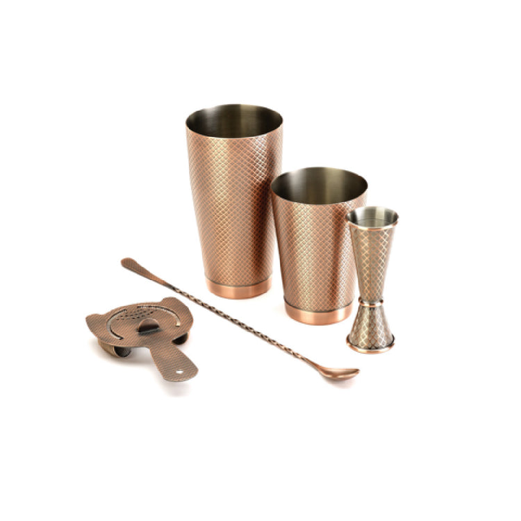 The Mercer Culinary M37206ACP Barfly® Diamond Lattice Basic Set is an essential 5-piece collection engineered for both professional mixologists and home bartending enthusiasts. This comprehensive set includes a meticulously crafted full-size shaker and a half-size shaker, both featuring a stunning antique copper-plated finish that enhances any bar setup. Complementing these are a precision-oriented 1 oz. x 2 oz. jigger for accurate ingredient measurement, a 13-3/16" bar spoon designed for seamless stirring, and a heavy-duty spring bar strainer optimized for smooth cocktail creation. Constructed from 18/8 stainless steel, this set promises longevity and resilience, making it a reliable choice for high-volume bars and casual drink makers alike. The set is elegantly packaged in a color retail gift box, making it an ideal gift choice for cocktail enthusiasts. The combination of functionality and sophisticated design makes this set a versatile addition to any bartender’s arsenal, meeting the demands of diverse market segments ranging from high-end bars to personal kitchens.
