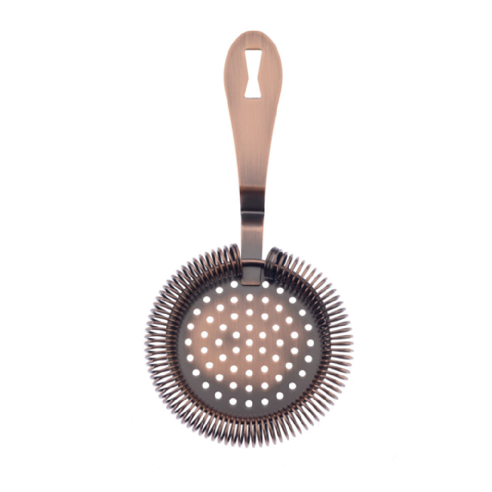 The Mercer Culinary M37218ACP Barfly® Deluxe Antique Hawthorne Bar Strainer - 7 1/4" Overall Length is a meticulously crafted tool designed for professional bartenders and cocktail enthusiasts. This strainer is constructed from 18/8 stainless steel, ensuring durability and resistance to corrosion, which is crucial for frequent use in high-demand environments such as bars and restaurants. Its Antique Copper-plated finish not only provides an elegant and timeless aesthetic but also enhances its resistance to wear and tear. The strainer includes a practical hanging hole, allowing for convenient storage and accessibility during busy service hours. Its 7 1/4-inch overall length is optimized for compatibility with most standard-sized cocktail shakers, delivering seamless integration into your cocktail preparation routine. This product caters to the needs of diverse market segments within the hospitality industry, from upscale cocktail lounges to bustling bar settings, where both functionality and appearance are highly valued. The Barfly® Deluxe Antique Hawthorne Bar Strainer stands out as a reliable and visually appealing choice, reflecting Mercer Culinary's commitment to quality and innovation in barware products.